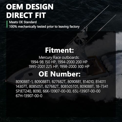 ?Vehicle Fitment?Yezoauto fuel pump compatible with Mercury Mariner Outboard Engine150 175 200 225 250 HP 1993-2002 ?Interchange Part Number?OE# 809088T-1 809088T1 827682T 8090881 814010 814011 14307T 808505T 827682T 808505T01 809088T 18-7341 SPJET240 8090 66K-13907-00-00 65L-13907-00-00 67H-13907-00-0 ?Function?The fuel pump assembly is the heart of a vehicles fuel delivery system. Its function is to supply clean pressurized fuel to the fuel injectors. In addition to this, it provides the fuel level reading to the vehicles instrument cluster, shuts off the fuel nozzle when refueling, among many other critical functions ?Installation?1.Compare the replacement pump to the new pump assembly to ensure a match.2.Install the new seal ring and new pump assembly in the tank.3.Using a transmission jack, raise the tank just enough to reconnect the fuel hoses, electrical connections and emissions hoses.4.Reinstall the fuel filler neck and secure it with a clamp.5.Reinstall the fuel tank straps and torque the mounting bolts to the specification listed in the factory repair manual.6.Reconnect the negative battery cable. ?1-Year Manufacturer?Yezoauto is committed to providing better service and products to our customers, we make sure that every assembly line is harshly inspected and 100% tested before assembly to ensure as much as possible that the product will not have problems. If you encounter any problems during the use of the product, please leave us a message, we will give you a satisfactory answer within 18 hours!