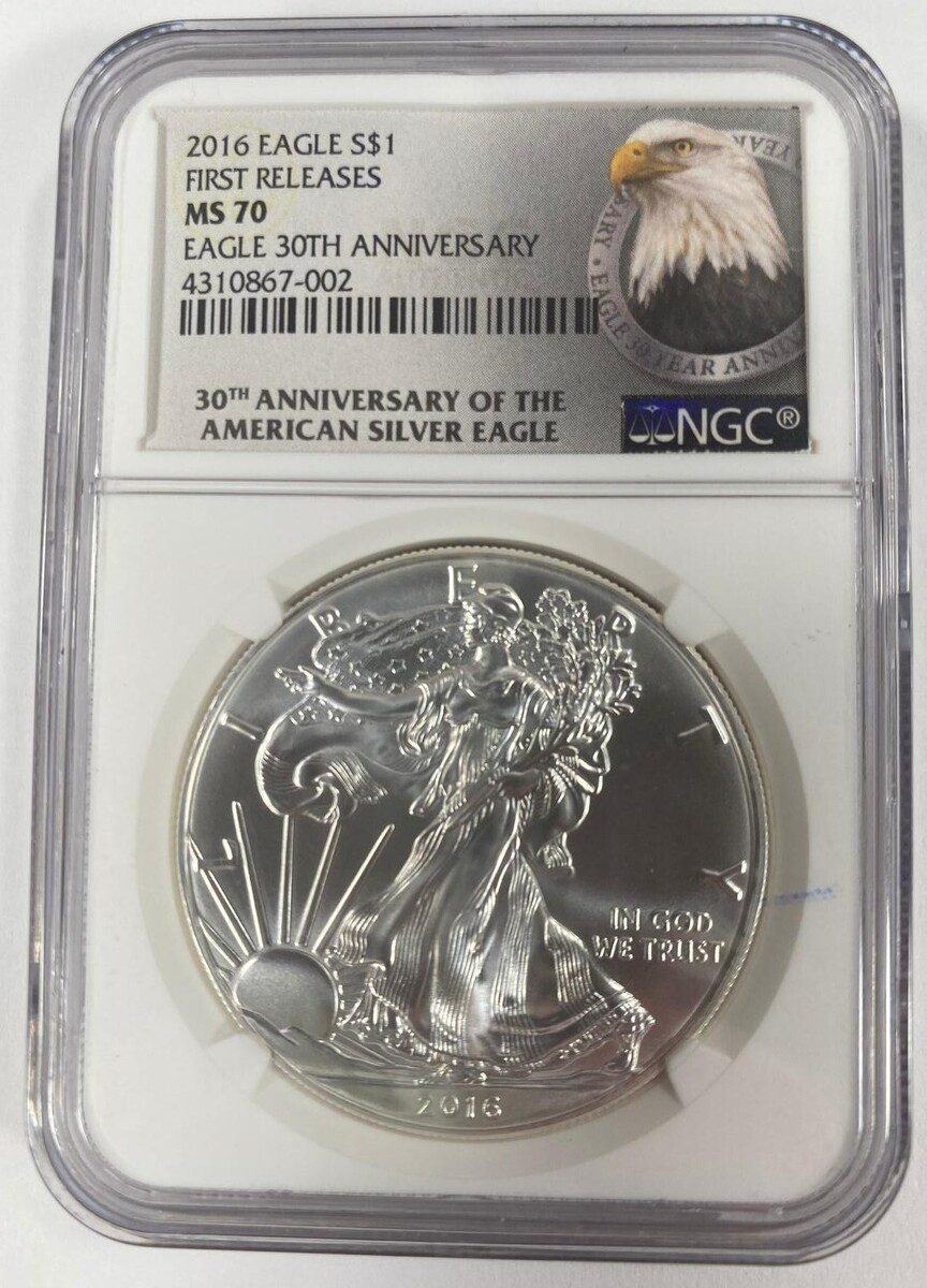 2016 S$1 Silver American Eagle Valutato Da NGC Come MS70 Prime Uscite 30 Ann.