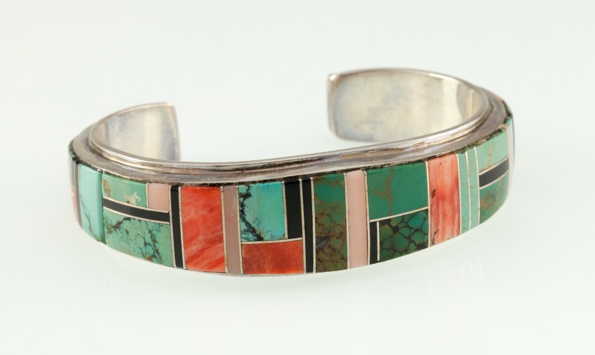 Vtg. Navajo Inlay with Orange Spiny, Turquoise & Black Jet Cuff Bracelet 53.9gr