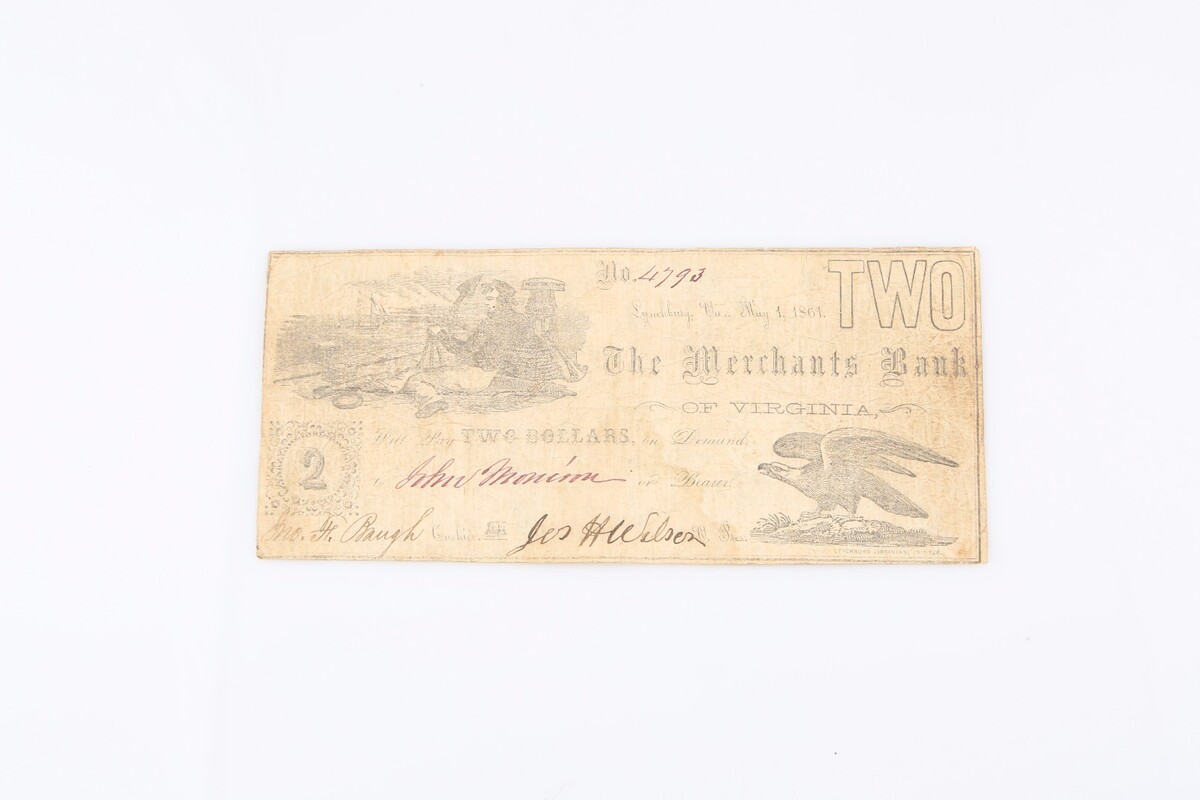 1861 Confederate Two Dollar Note Merchants Bank Lynchburg Virginia Civil War