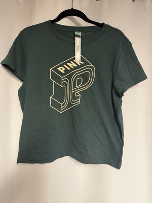 Victoria’s Secret PINK LOGO Forest Green Cropped Short Sleeved T-Shirt Large NWT