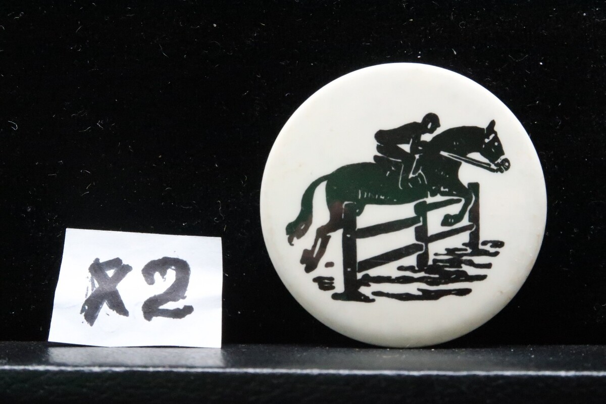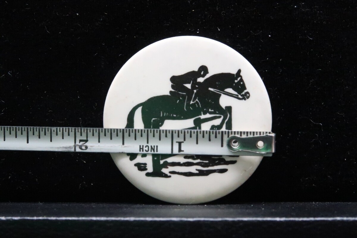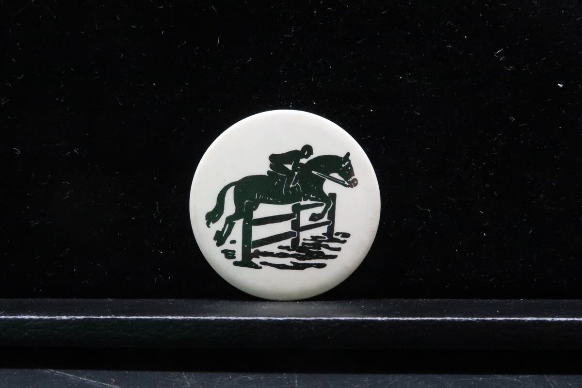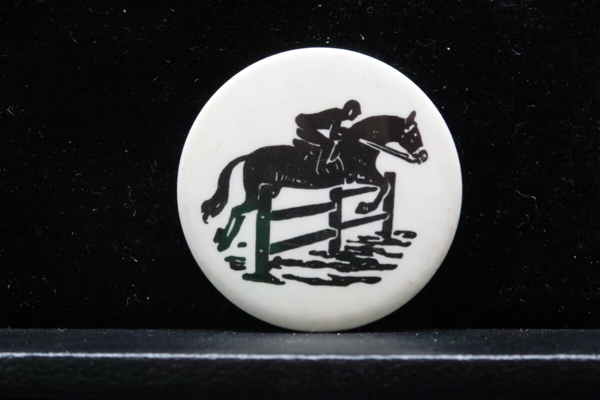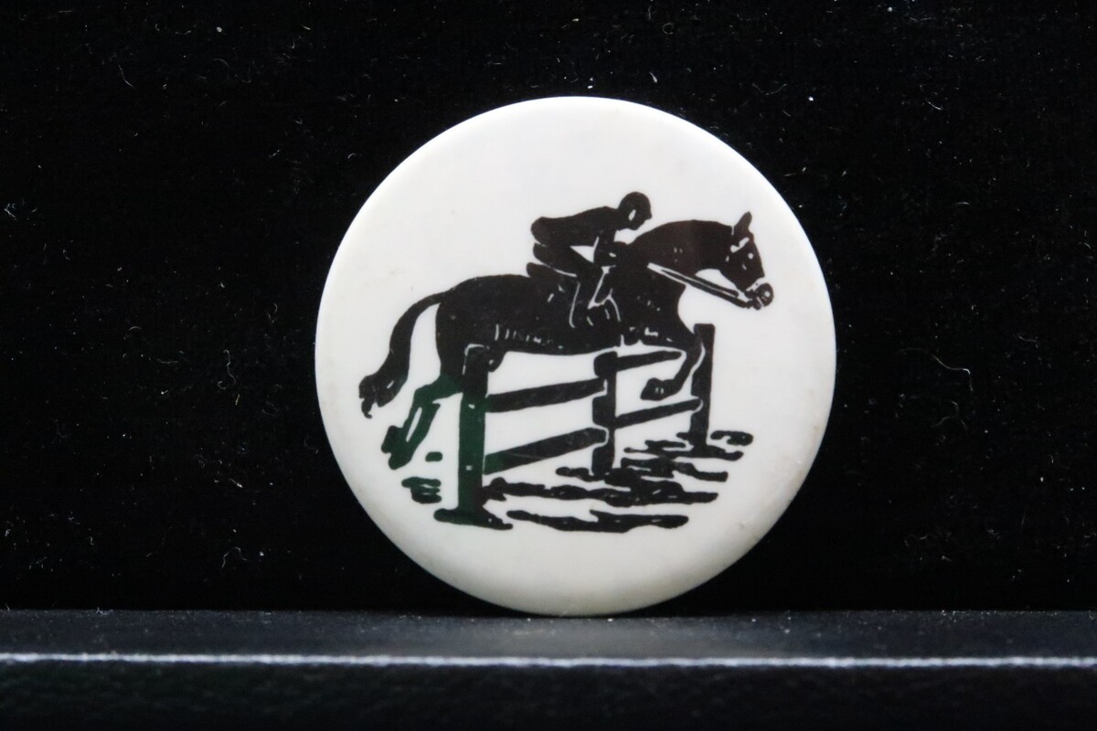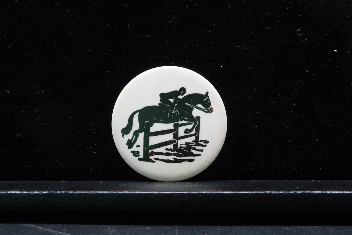 Vtg Horse Bridle Button Brooch White & Black Jockey Leaping Rider Equestrian