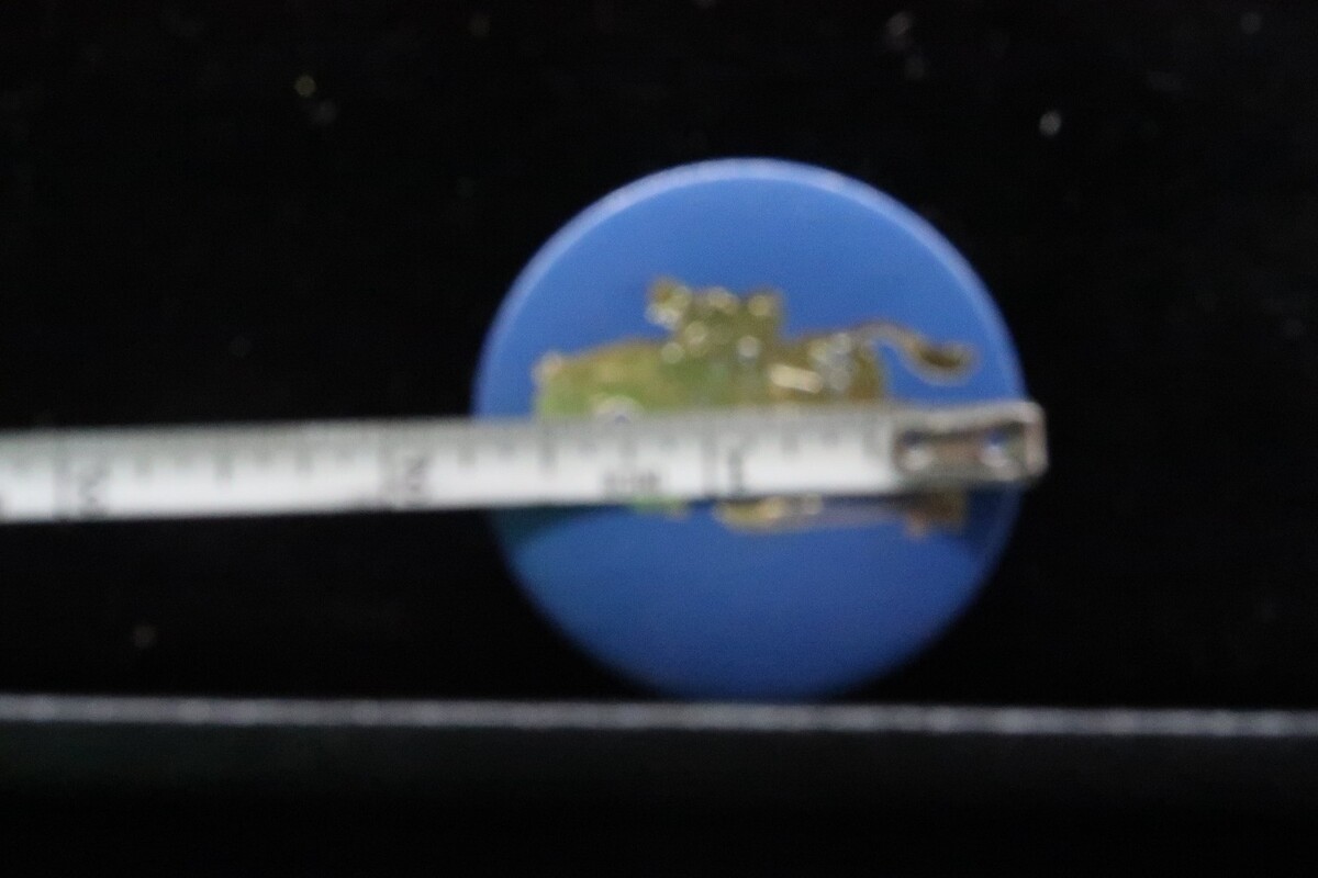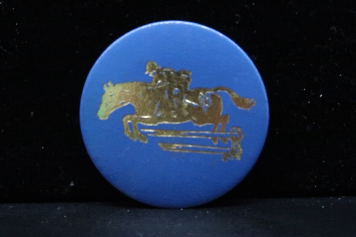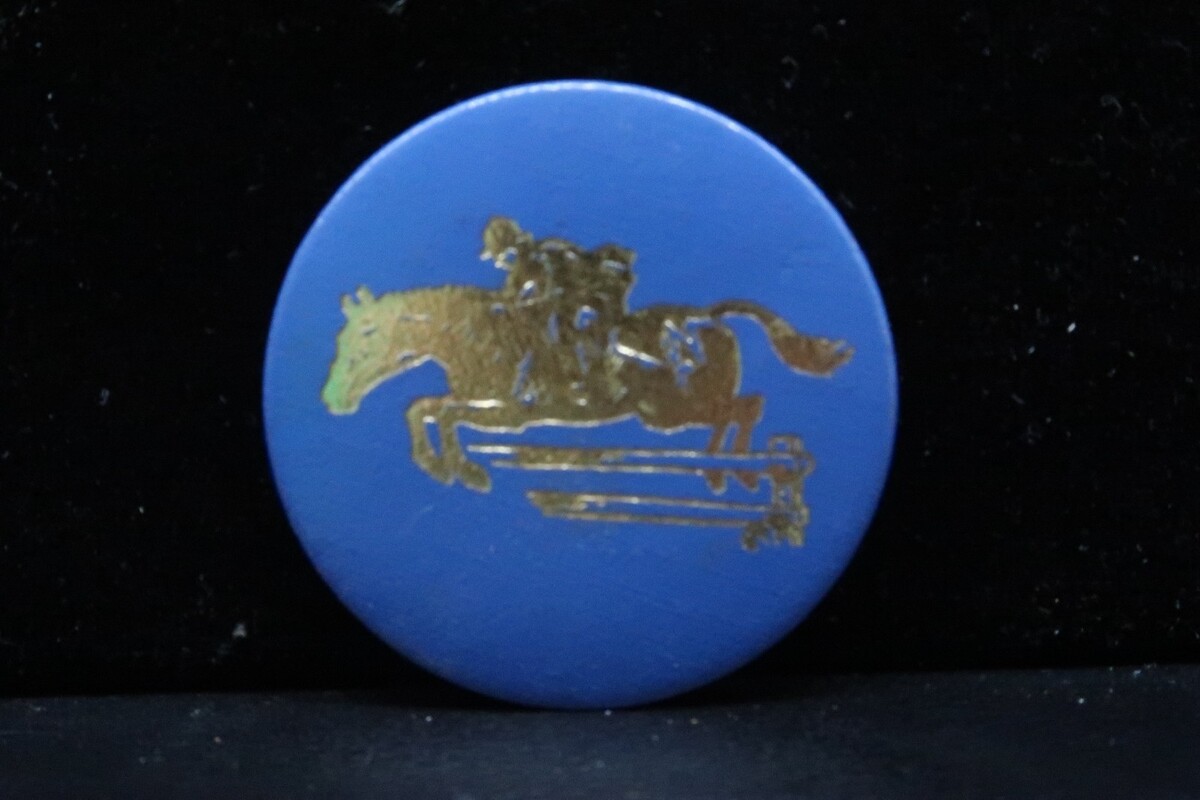 Vtg Blue Horse Bridle Button Brooch Gold Tone Jockey Leaping Rider Equestrian