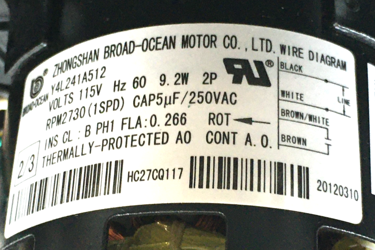This is Zhongshan Y4L241A512 Draft Inducer Blower Motor HC27CQ117 115V 2730 RPM(1SPD) no p/s used part.