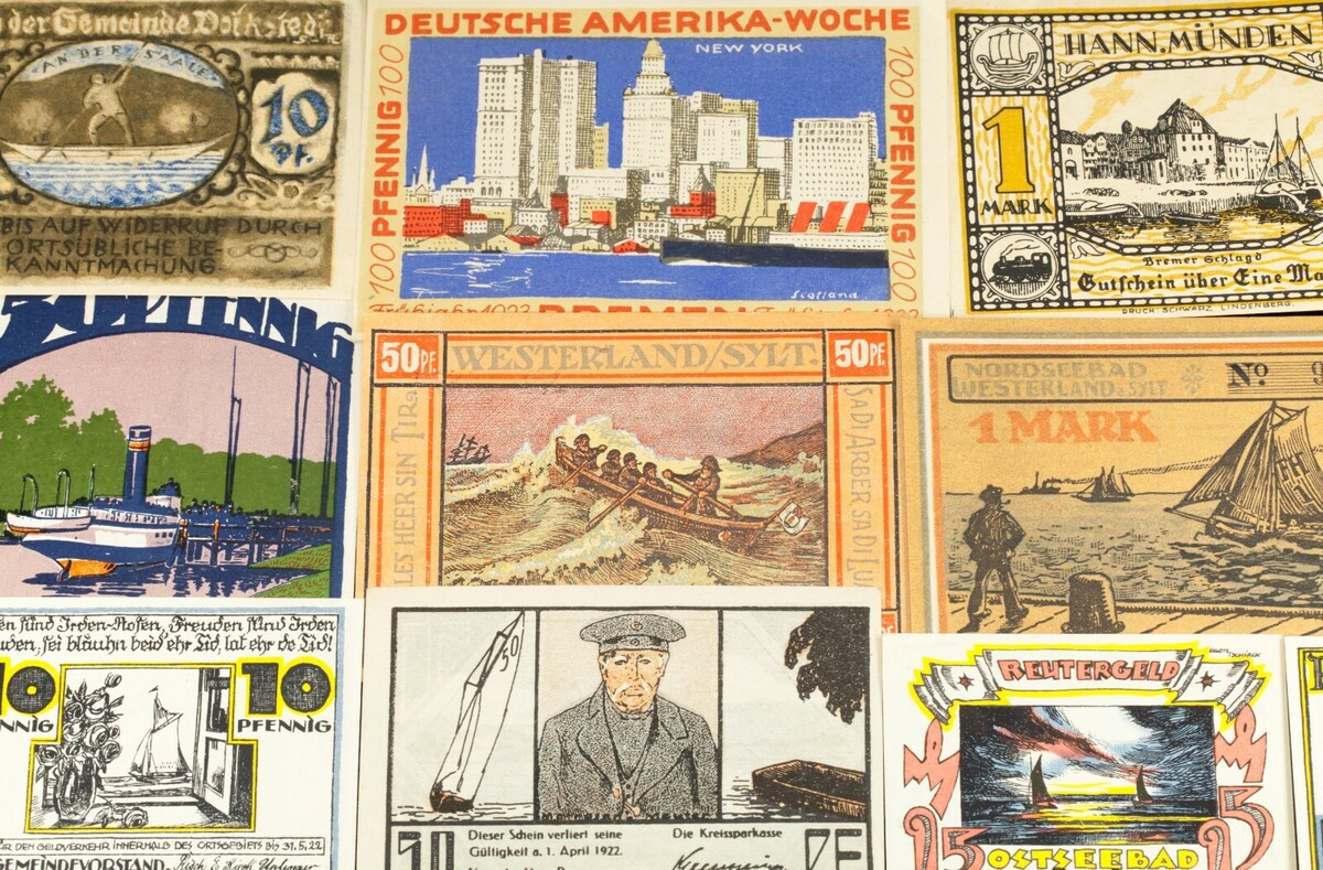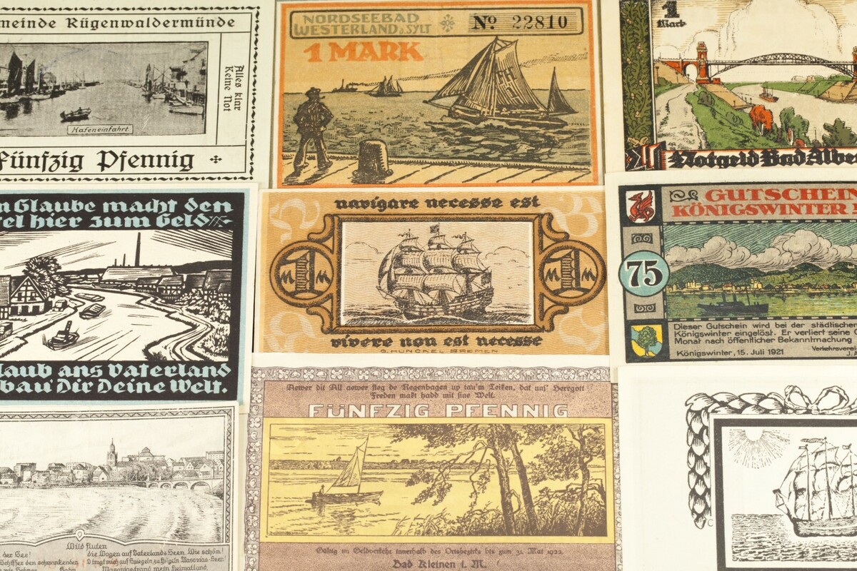 This lot will include 25 individual notgeld notes from Germany after World War I. All will be in Extra Fine to Uncirculated (XF-UNC) condition. Face values between 5 pfennig to 5 mark. Nautical theme; ships and boats.