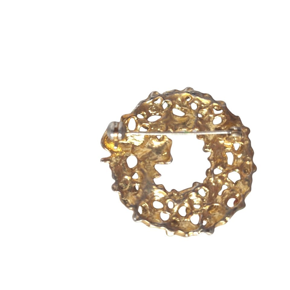 Vintage Gold Tone Green Enamel Christmas Wreath Brooch Rhinestones Jewelry