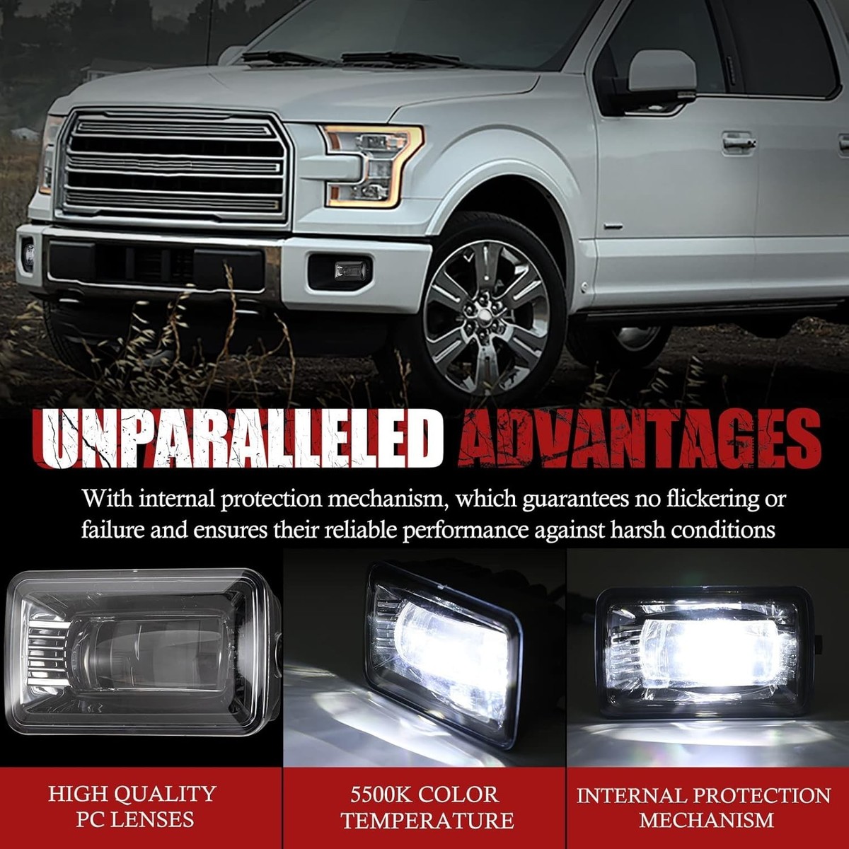 HIGH QUALITY FORD LED FOG LIGHTS: PC lenses,more strong and durable than oem with glass lenses or other passing lamps. With internal protection mechanism, which guarantees no flickering or failure and ensures their reliable performance against harsh conditions