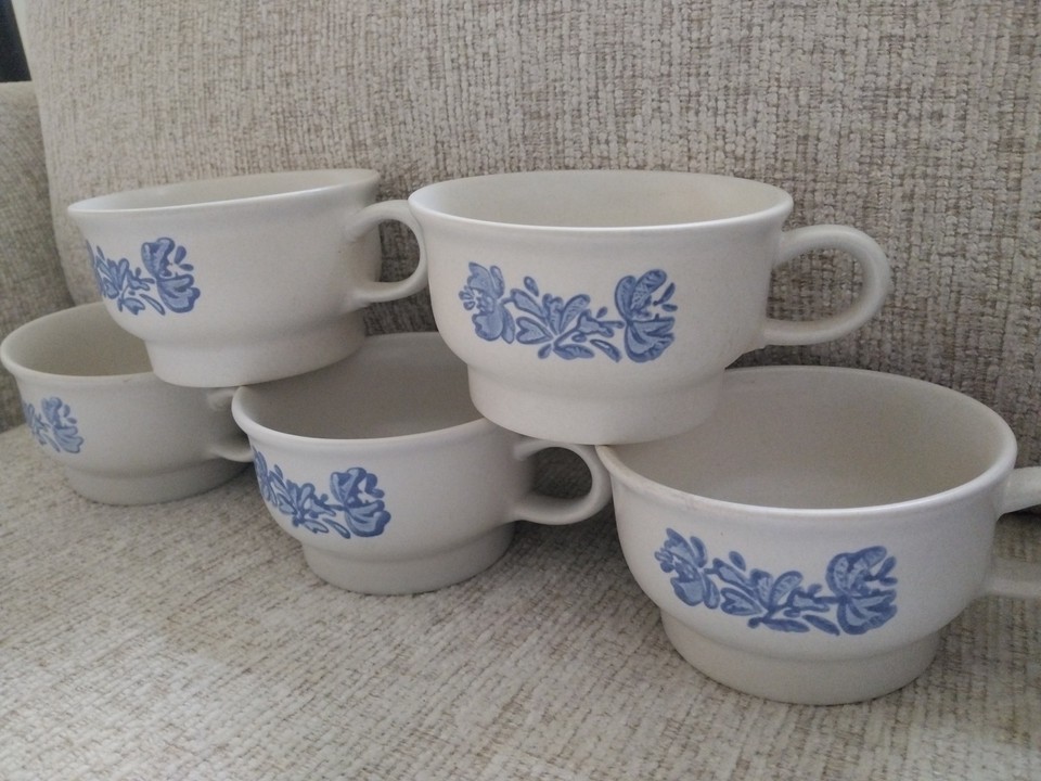 This vintage set of 5 Pfaltzgraff Yorktowne stoneware coffee soup mugs with handles and bowls are perfect for all occasions. Made in the United States, these gray/blue mugs feature the classic Yorktowne pattern and are marked with an impressed brand stamp. With their four-piece design and stoneware material, these mugs offer both functionality and a touch of nostalgia for collectors of vintage pottery and glass.