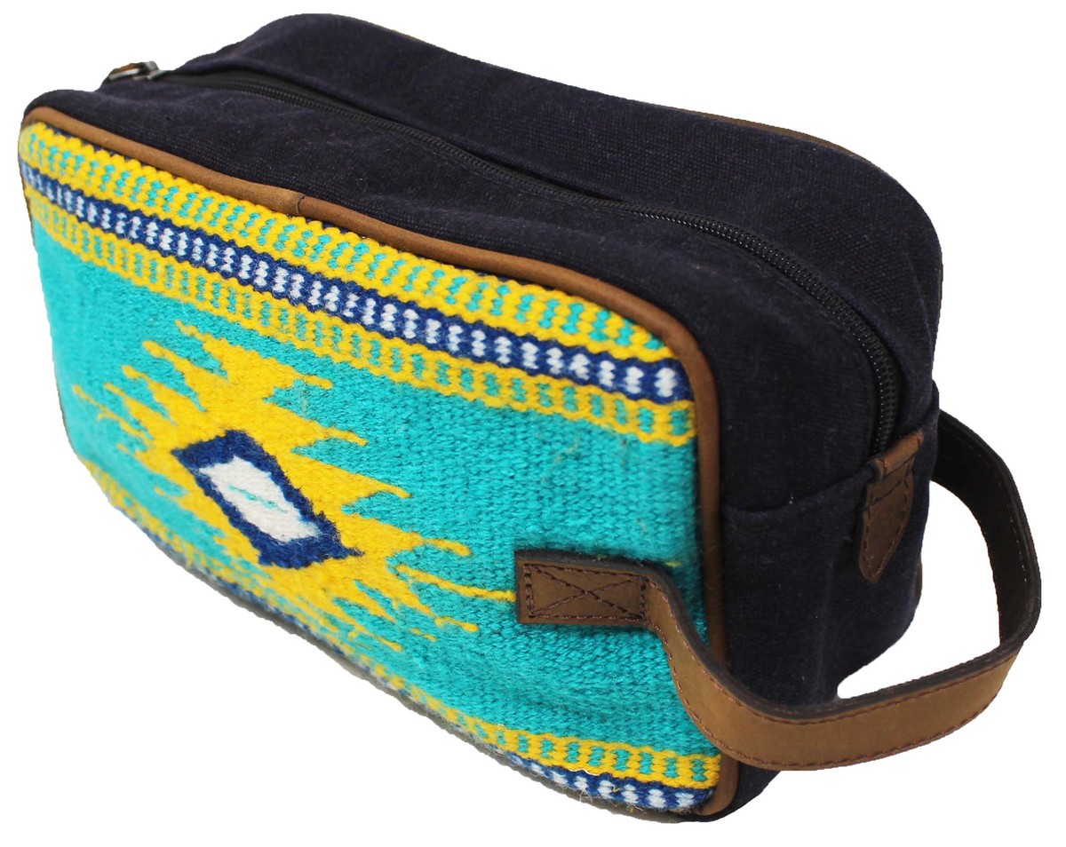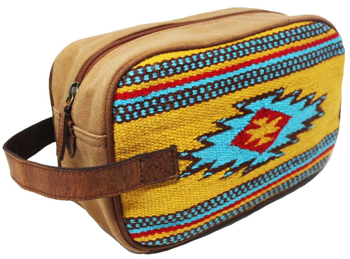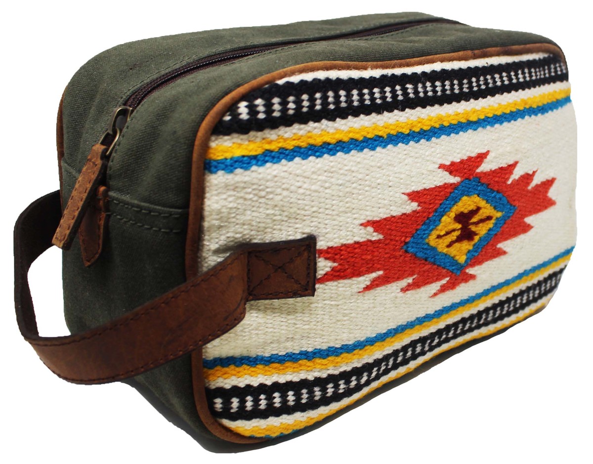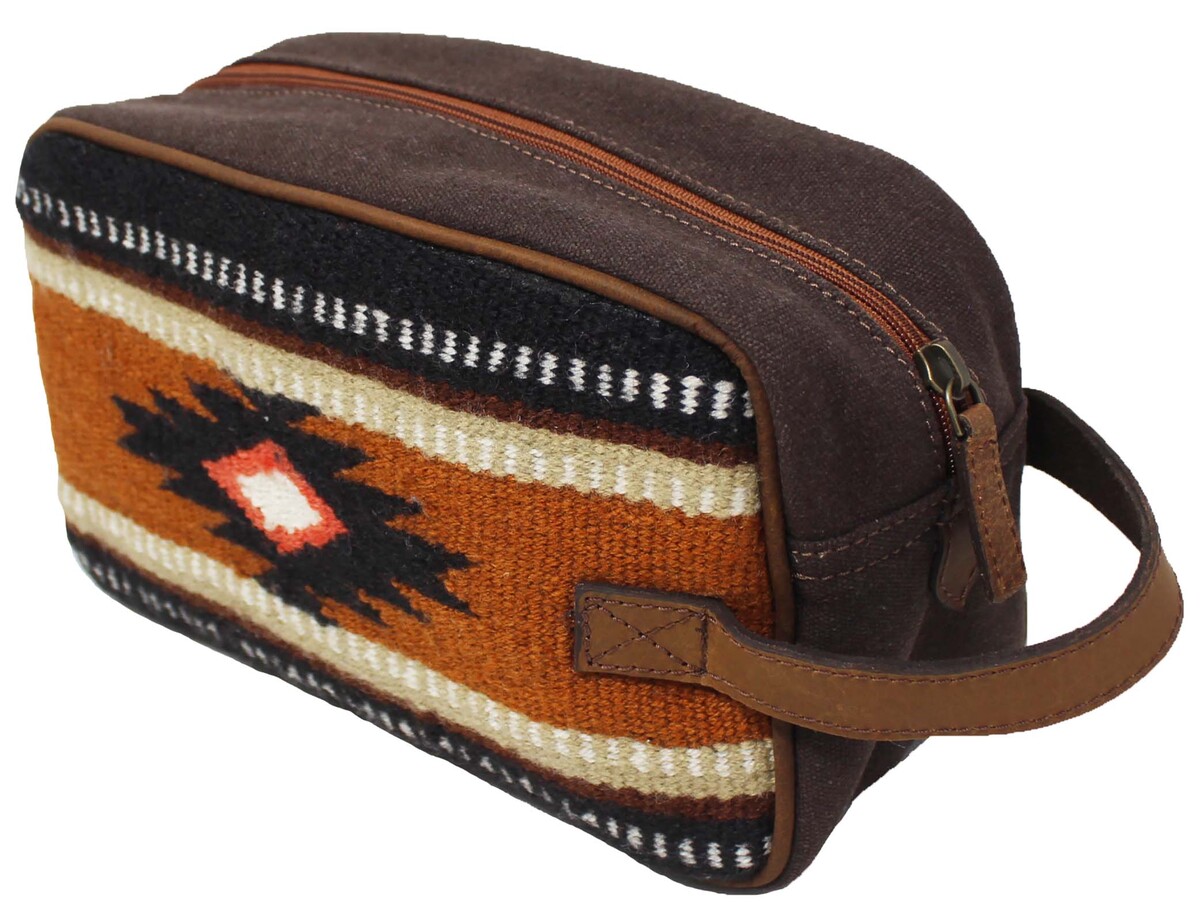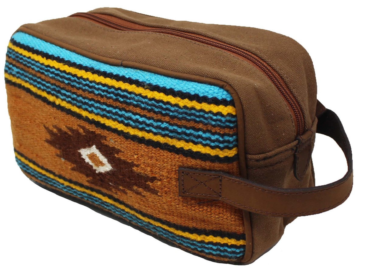 Challenger dopp kit toiletry bag hand crafted from lightweight, yet rugged canvas with full-grain distressed brown leather reinforced accents. Bag comes uniquely accented with a hand-woven saddle rug multicolor design. Makes a great gift, perfect choice for traveling and vacations. Conveniently sized spacious bag fits all cosmetic and toiletry essentials. Wipeable interior lining ensures easy clean up in case of accidental spills. There is one side zippered pocket inside, and another on the outside for organized storage. Bag measures 10" L x 4" W x 6" H.