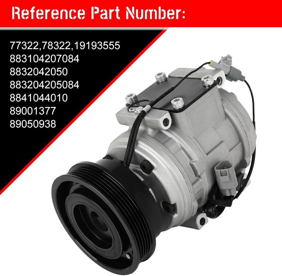 Fast Cooling Air Conditioning Compressor Vehicle: 1998-2000 Fit for Toyota RAV4 ,1998-2000 Fit for Toyota RAV4 2.0L, Oil Type: PAG46, Internal Oil Content 130ml, Pulley Grooves: 5, Compressor Type: 10PA15L; Pulley Diameter (mm): 120 Characteristic: As a high-speed rotating working part, AC compressor meet trouble frequently. Common faults have abnormal noise, leaks, and doesn't work because electric circuit problem. Our compressor meet OE standard, seldom have these trouble AC Compressor Pump Durability: Temperature protection and insulation to ensure durability Installation: Air conditioner compressors plays the most important rule in the air conditioning system, responsible for pumping refrigerant throughout vehicle A/C system. You'd better follow professional repair advise Noiseless AC Compressor with Clutch Part Number: 77322,78322,19193555,883104207084,8832042050,883204205084,8841044010,89001377,89050938