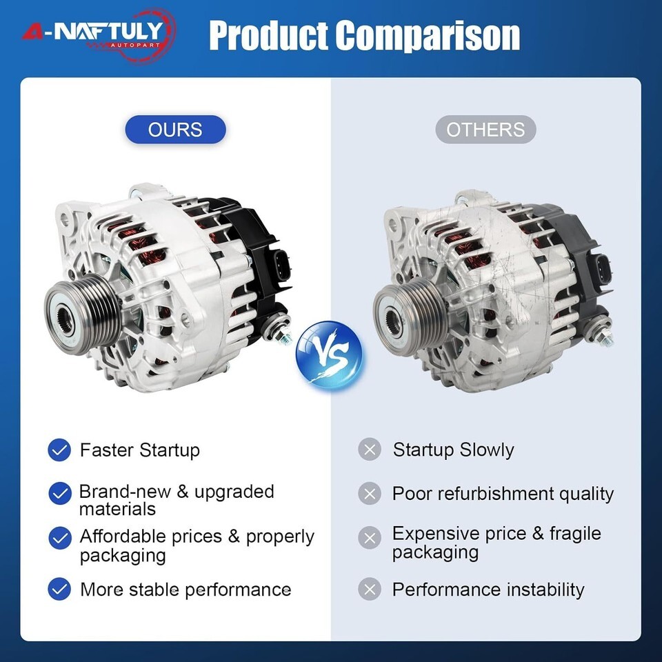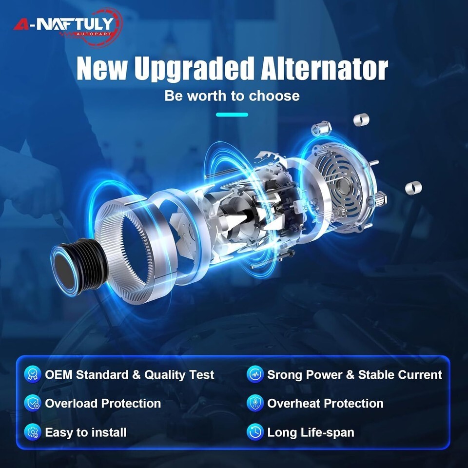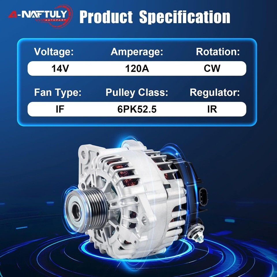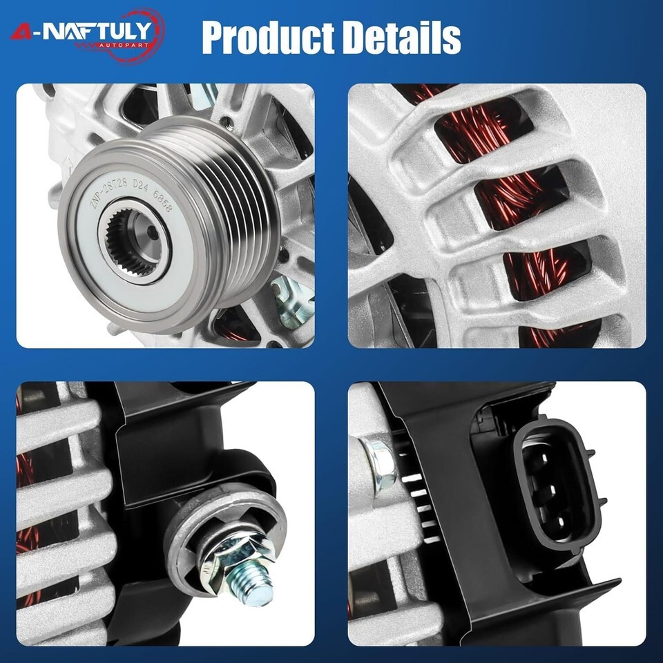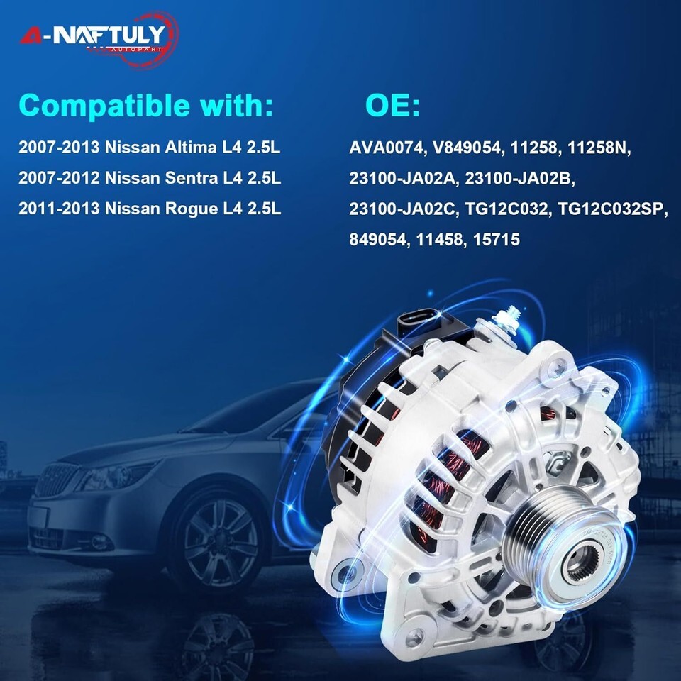 [Compatibility] New alternator for Nissan Sentra 2007 2008 2009 2010 2011 2012, Nissan Altima 07 08 09 10 12 13, Rogue 2011-2013. Before purchasing this order, please check the description to confirm your vehicle model compatibility [Specifications OE Part Number] 120Amp/12 Volt, CW, 6-Groove Clutch Pulley, IR/IF. Replace OE# AVA0074, V849054, 11258, 11258N, 23100-JA02A, 23100-JA02B, 23100-JA02C, TG12C032, TG12C032SP, 849054, 11458, 15715 [Brand-new Upgraded Alternator] High output alternator is made of pure copper wire, rotors and stators calibrated, external insulating coating to prevent short circuit, dissipate heat easily, reduce power loss, ensure the power generation more stable and faster startup, solve the strange noises, warning Light on the dash, dead battery and other faults [Easy Installation Strict Test] OE standard design ensure perfectly match for your original factory alternator, directly replacement, easy to install. No-load/load/quality test has been passed to ensure 100% performance, to get a reliable operation and long service life [Including]: A-NAFTULY Alternator and Properly Packaging Box. Welcome guide, our worry-free 18-month-warranty. If you find they don't work, get stuck or any defect, please reach out to us regarding any concerns, and we will be happy to assist you