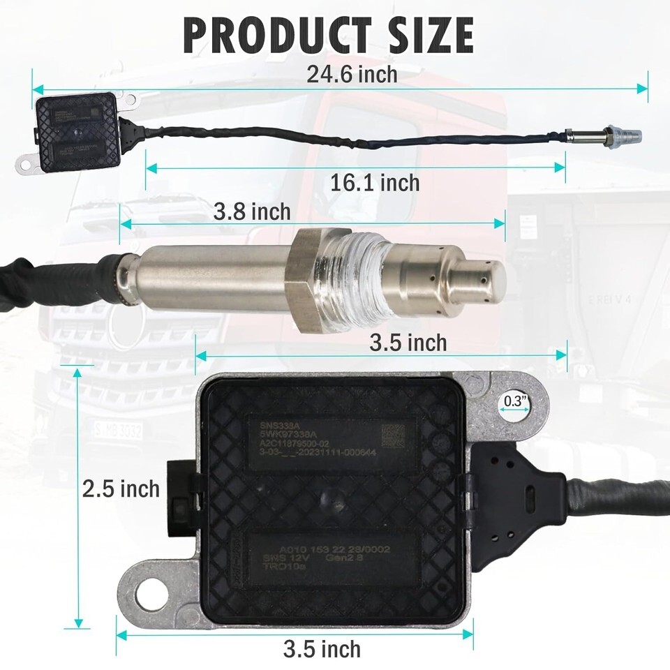?[Manufacturer Part Number]- A 010 153 22 28, 5WK9 7338A, 0101532328, A1037338A, 57206. Please check the OE number before purchase to ensure this Nox Sensor is suitable for your model. ?[Compatible with] - Mercedes Benz DDE DD13 DD15 DD16, Freightliner Cascadia 2012-2022, Western Star 2016-2022. ?[Easy to Install]- OEM quality, can direct replace the old or damaged one with a new NOx sensor replacement. ?[HIGH QUALITY]- Made of durable, high-quality 409L titanium-stabilized ferritic alloy, which provides enhanced strength and durability for consistent performance and a long service life. ?[Response Support]- We stand behind the quality of our products and are confident that our product will provide reliable performance. If you have any problems with your NOX SENSOR, simply contact us on Amazon, and we will reply within 24 hours to help resolve your issue.