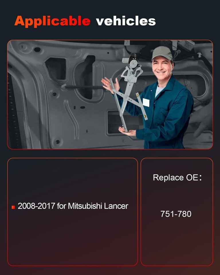 Compatible For: 2008 2009 2010 2011 2012 2013 2014 2015 2016 2017 for Mitsubishi Lancer Replacement Window Regulator With Motor OEM Number:751-780 Replacement Window Regulator Installation location:Front Left(Front Left Driver Side) .Plug and Play,NO wire splicing necessary,reliable installation of the hole with the original car exactly the same, easy to install OE Replacement: Window Regulator with Motor has been evaluated thousands of times in actual car doors to verify its performance durability under cyclic loads with smooth lifting operation,Easy Fit Note:Please confirm whether the year, model, and other information of your vehicle match the product information