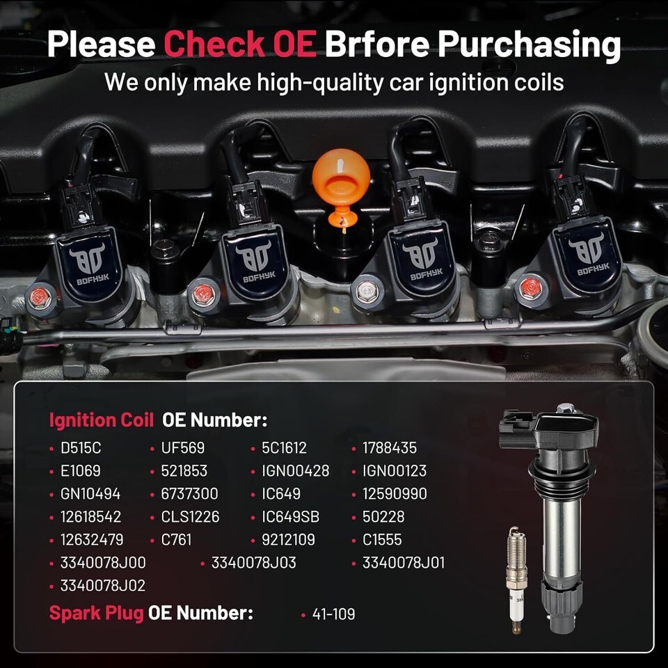 ?Basic Info:?Ignition Coil UF-569 Spark Plug 41-109 are fitting for Buick Cadillac Chevrolet GMC Saturn. Please check detail fitting info from pics or detail page. OE checking is necessary before buying. ?Features of ignition coil:?High quality coil packs are made of silicon steel material, Japan-imported rubber, and Germany-imported varnished wire, which makes our products have a long using life and better quality. ?Please check OE:D515C,3340078J01,3340078J02,UF569,5C1612,1788435,E1069,521853,IGN00428,IGN00123,GN10494,6737300,IC649,12590990,12618542,CLS1226,IC649SB,50228,12632479,C761,3340078J00,3340078J03,9212109,C1555. ?Features of spark plug:?Professional spark plus is made of high-tech materials. We choose iridium electrode and unique ceramic to make sure your car can have a new life after being installed. The car will start quickly and speed up in a short time as powerful as a new car. ?Please check OE: 41-109. ?Yes, you need a new one!?If your car has been used for a long time(over 80000km) and has problems like car shaking, start-up failure, speeding up slowly, and increasing fuel consumption, you may need to change a new set of spark plugs and coil packs. BDFHYK ignition coil and spark plug can offer you a professional user experience and make your car like new. You may choose it with confidence. ?About BDFHYK?A professional auto parts manufacturer with mature industry lines. We have our factory and experienced developer. It's been more than 10 years that we have served different customers from different areas. We do our best to hear from customers and update our products. If you have more problems, please be free to contact us. Choose BDFHYK; choose good service.