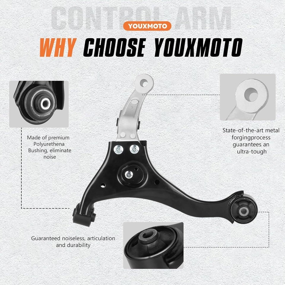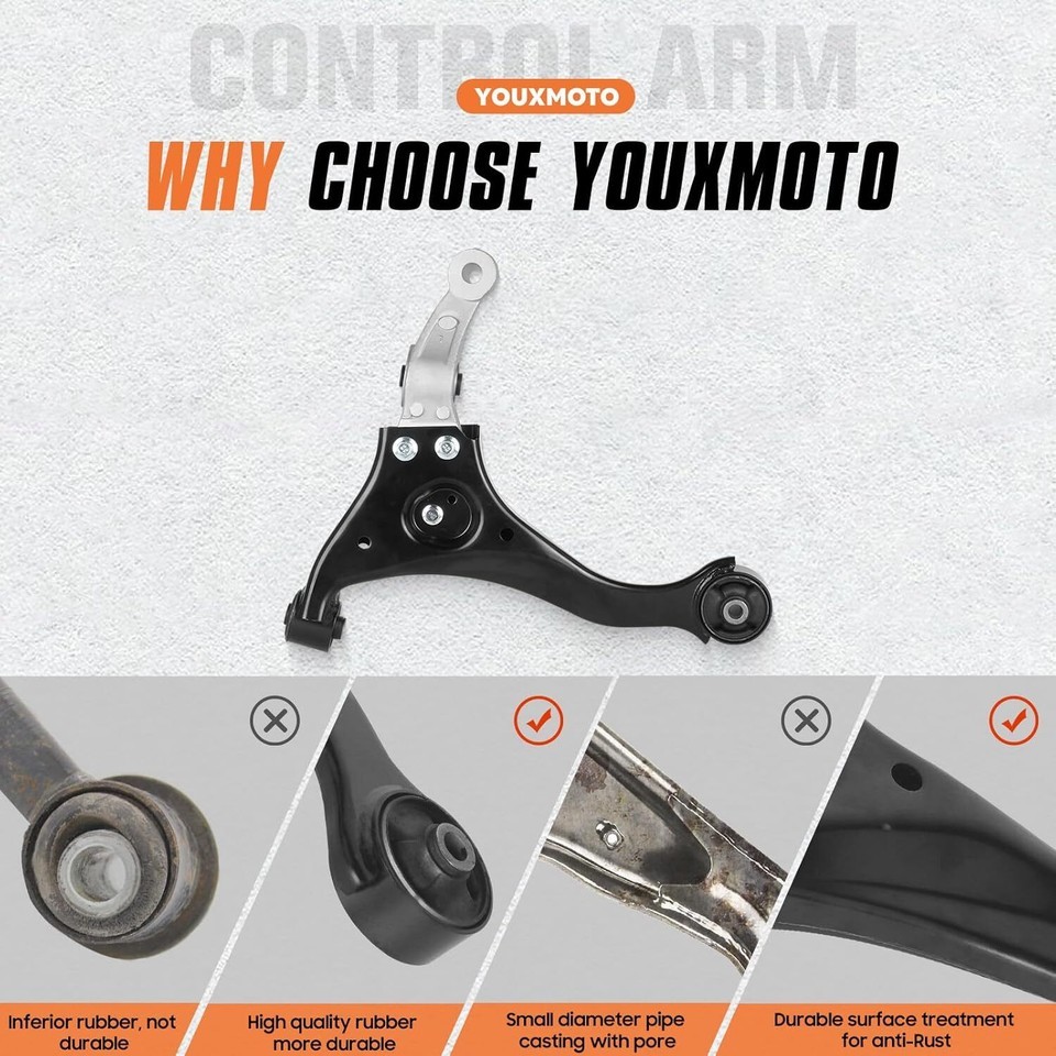 ?Compatibility?Fits for Hyundai Sonata 2006 2007 2008 2009 2010 ?Kit Includes?1x Front Lower Left Control Arm Assembly, 1x Front Lower Right Control Arm Assembly, 2x Front Lower Ball Joint Driver Passenger Side ?Enhanced Structural Strength?High-strength structure can withstand repeated impact loads, making it more stable during operation ?Premium Ball Joints?For noise-free, articulation and durability, we sourced premium ball joints for our tubular upper control arms. Compared to other common ball joint brands, our ball joint exhibits one of the highest articulation angle. ?Safety?Control arm with strong torsional resistance, good stability, better response to wear and fatigue, and long service life.