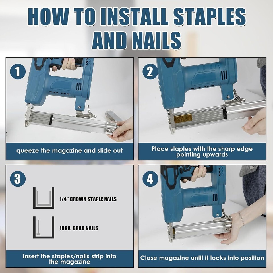 Compatibility: LEZZYRUCK Cordless Stapler/Nailer Compatible with Makita 18V LXT Battery Model: BL1860B BL1860 BL1850B BL1850 BL1840B BL1840 BL1830B BL1830 BL1820B BL1820, You can make full use of your LTX 18V battery and conserve resources if you already own it. (The package does not contain batteries). 2-in-1 Cordless Nailers Staplers: A wide range of accessories for DIY enthusiasts. You can easily switch between staples and nails without having to convert the device. The electric tacker is a functional all-rounder in the home, workshop or craft room. Number of Staples/Nails: Approx. 2400 (1.5Ah batteries), 3200 (2Ah batteries), 4800 (3Ah batteries), 6400 (4Ah batteries), 8000 (5Ah batteries), 9600 (6Ah batteries). Safety Protection: Cordless staple gun utilises the double protection mechanism of switch and safety contact. Only when the switch is actuated and the safety contact is fully pressed onto the object surface can the nail gun battery be activated and fired to prevent accidents caused by a false start. No Damage to the Work Surface: The lightweight cordless nailer makes it easier to work indoors and outdoors. Practical safety nose prevents accidental triggering and does not damage work surfaces.