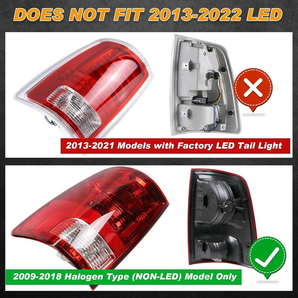 Fitment:Tail light compatible with Dodge Ram 1500 2009-2018|Dodge Ram 2500 3500 2010-2018|Dodge Ram 1500 Classic 2019-2020.NOT fit 2013-2021 LED taillight model Install:Plug and play,direct replacement only takes a moment.Good fit lined up with the original hole Bright:Light housing is stronger and high light transmission,with bulbs make brighter.Safer after solving the issue of breakage and yellowing Waterproof:Strict sealing process to ensure no water ingress.Works well in extreme rain and snow conditions Protection:Great support come with Nakuuly,we'll give you a satisfactory solution whether it's broken or doesn't work.Replace tail lights make your Ram look new again