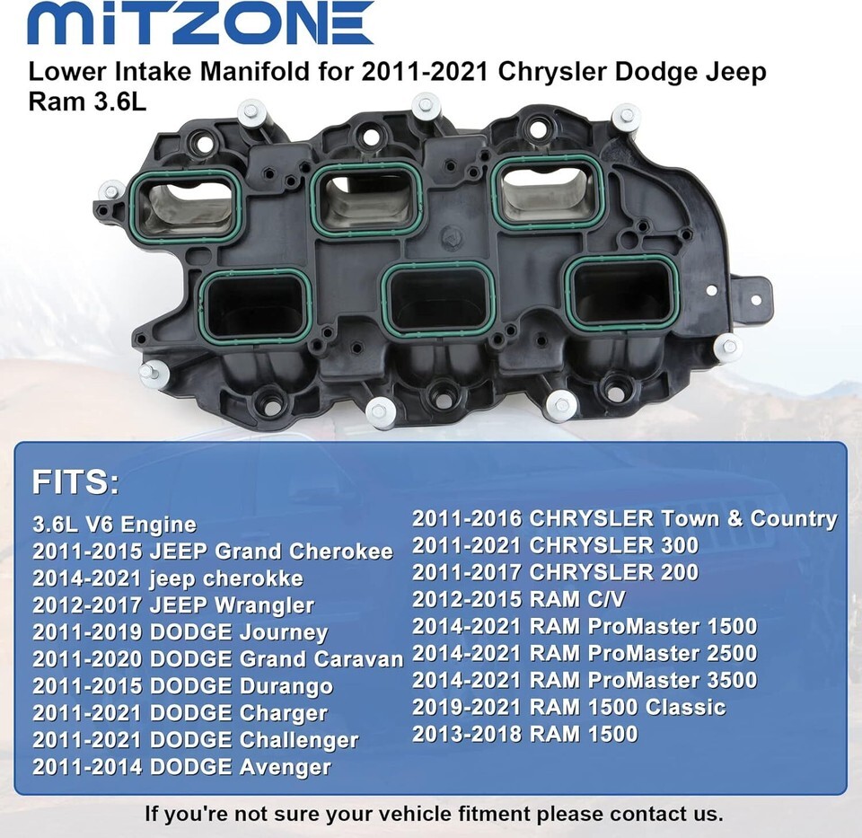 INTAKE MANIFOLD KIT FITMENT 1: Compatible with 3.6L Pentastar V6 Engine Dodge Jeep, 2011-2015 Grand Cherokee, 2014-2021 cherokee, 2012-2017 Wrangler, 2011-2019 Journey, 2011-2020 Grand Caravan, 2011-2015 Durango, 2011-2021 Charger, 2011-2021 Challenger, 2011-2014 Avenger INTAKE MANIFOLD KIT FITMENT 2: Compatible with 3.6L Pentastar V6 Engine Chrysler Ram, 2011-2016 Town Country, 2011-2021 300, 2011-2017 200, 2012-2015 C/V, 2014-2021 ProMaster 1500, 2014-2021 ProMaster 2500, 2014-2021 ProMaster 3500, 2019-2021 1500 Classic, 2013-2018 1500 PACKAGE INCLUDES: Intake Manifold, Bolts, Gasket ADVANTAGES: MITZONE intake manifold is made of upgrade material to withstand extreme temperatures and without leaking. This product is suitable for materials and prevents deformation and warping caused by high temperature PURCHASE WITH CONFIDENCE: If you are not sure about the vehicle fitment or any questions or concerns, please message us via amazon. We will resolve the issue to meet your satisfaction