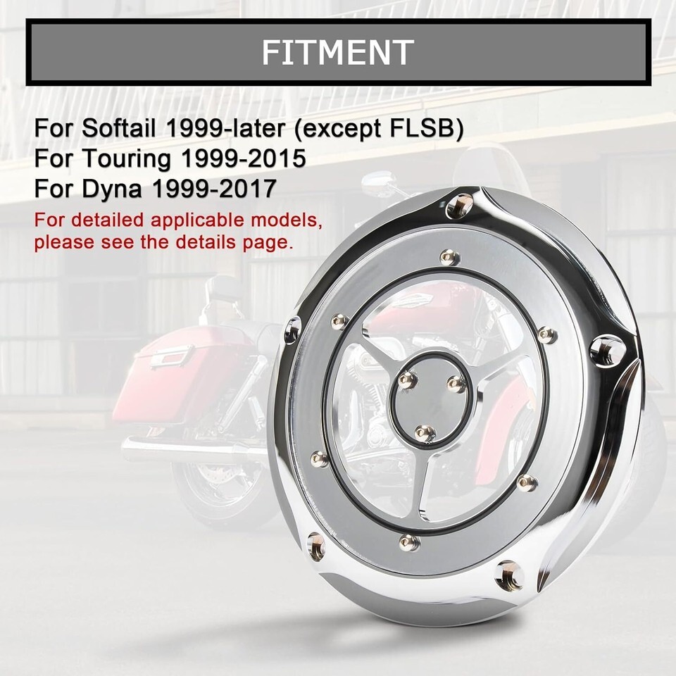 ?Fitment?Dyna Primary derby cover Fit for Big Twin Touring 1999-2015,Softail 1999-2021 (except FLSB),Dyna 1999-2017,Evolution 1340 1999-2000,Trike models 1999-2015(except FLHTCUL, FLHTKL or 2007-2015 Touring or Trike models with Narrow-Profile Outer Primary Cover P/N 25700385 or 25700438).NOTE:Installation on Dyna 2006-2017,Softail 2007-later,Touring 2007-2015 and Trike models require separate purchase of Gasket P/N 25416-99C. ?Color?Dyna clutch cover is Chrome, our heritage softail primary cover is not easy to fade. ?Material?Transparent clutch cover is made of high quality aluminum and the surface is clear acrylic,waterproof and durable. ?Application?Engine cover is used to cover the clutch of motorcycles.Softail derby cover?s main utility is to protect the workings of the clutch from possibly harmful dust and other possible contaminates.Road Glide derby cover comes with derby cover gasket, no need to worry about oil leakage.NOTE:No Installation Instruction,No Blot Included. ?Package?1 x Derby Cover + 1 x Derby Cover Gasket
