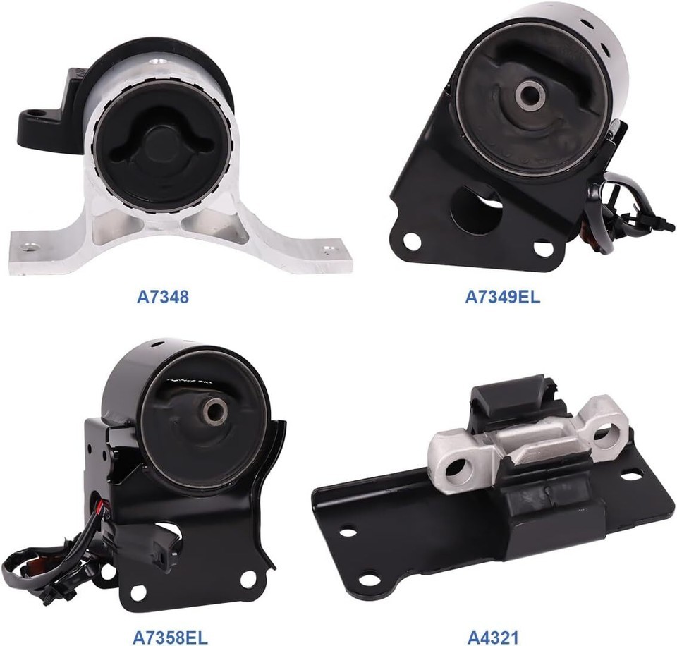 Compatible Vehicles: Motor mount set fit for Nissan Murano V6 3.5L, 2003, 2004, 2005, 2006, 2007 OEM: A7349EL, A7348, A7358EL, A4321, EM5672EM9223, EM5818, EM9414, 9252EL, 9223, 9248EL, 9414, 11270-8J10A, 11270-8J100, 11271-8J100, 11210-CA00B, 11 210-8J100, 11210-CA00A, 11210- CA09E, 11210-CA000, 11321-8J100, 11320-8J100, 11220-CA00A Mounting Positions: A7349EL: Front motor mount with sensor, A7348: Front right motor mount, A7358EL: Rear motor mount with sensor, A4321: Transmission mount Smooth Driving: Replacing old and damaged engine mounts and gearboxes can improve driving comfort and safety, say goodbye to vibration and noise, and make your car drive quiet and smooth Note: Please use the vehicle finder at the top to check if this product is compatible with your car