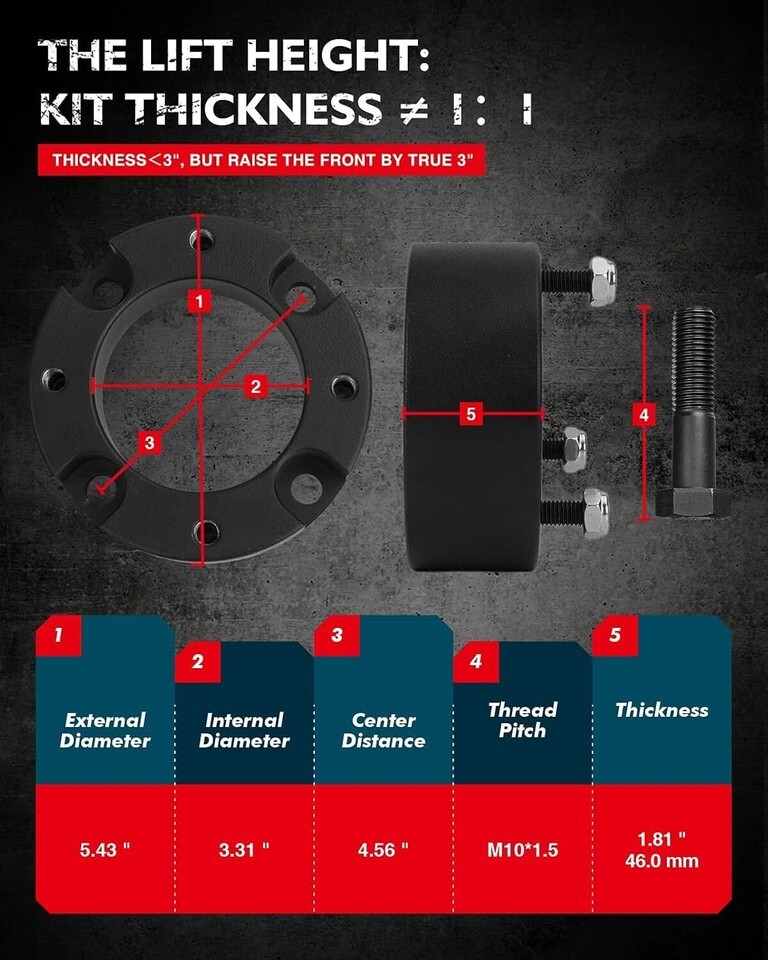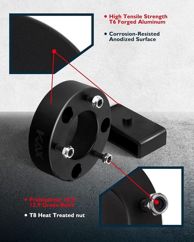 [Vehicle Fitment]: Compatible with Tundra 2021 2020 2019 2018 2017 2016 2015 2014 2013 2012 2011 2010 2009 2008 2007 [Function]: Improves the look of your vehicle and provides additional fender clearance for larger tires and wheels. With your truck's newly added height, your undercarriage will be a lot safer from damaging road obstacles [Specification]: Forged from 6061-T6 aluminum alloy,CNC automatic processing,surface anodic oxidation and heat treatment,not only ensure high precision and stability,but also enhance the hardness and corrosion resistance of the material [Easy Install]: Installation can be completed within 1-2 hours, No cutting and drilling required and does not require strut/coil disassembly like other kits [Service and Warranty]: All KAX Leveling lift kits are guaranteed for two years. If you have any questions about our products and services, please feel free to contact us