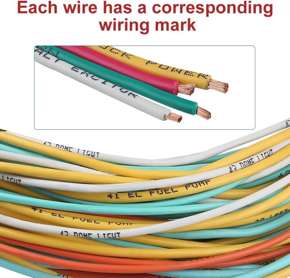 WMPHE 21 circuit wiring harness kit contains circuits: fan, horn, ceiling light, danger,radio, cigarette lighter, door lock, brake, trunk light, headlight, instrument, backup and cruise, wiper, choke, coil, air conditioning, power windows and turn signals, electric fuel pumps Line voltage: 12V; fuse: 18 fuses, made of standard copper wire and plastic parts, manufactured according to the standard used in the car, while controlling for accuracy and reliability This is the replacement electrical high temperature wire and the wire are long enough to be used in almost all vehicles. Every 5 inches are printed with easy to read characters to ensure correct installation. At the same time, a comprehensive manual with pictures is attached, so you don't have to worry about wiring This universal complete automotive wiring harness kit system has an easy to install design and has the ability to be expanded. It can be installed anywhere under the dashboard or seat. It is the choice for your car modification Please read the product details before purchasing to check whether it is suitable for you