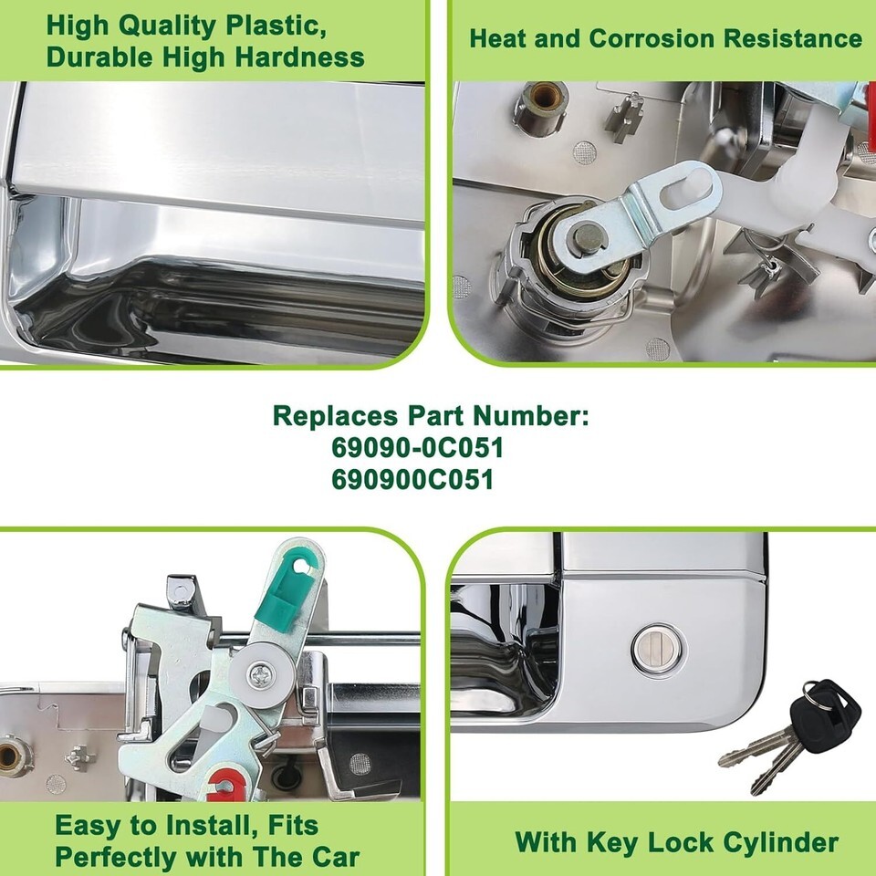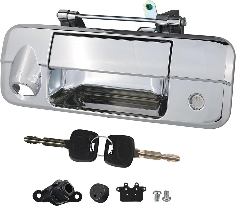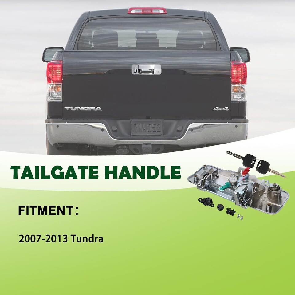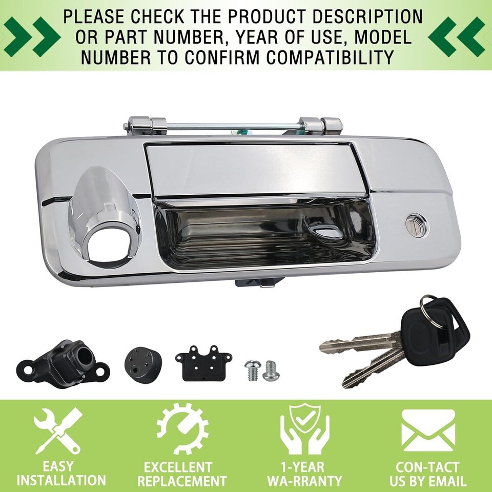REPLACEMENT PART NUMBER:69090-0C051 690900C051 81214 TO1915119 COMPATIBLE WITH:The tailgate door handle with rear camera hole compatible with 2007 2008 2009 2010 2011 2012 2013 07 08 09 10 11 12 13 Toyota Tundra,Please refer to the vehicle compatibility above to ensure proper part FEATURES:The rear latch handle with key lock cylinder with upgraded chrome plating process plastic and high-quality metal , high hardness,oxidation resistance,heat resistance,corrosion resistance,replacement of new parts and car perfect fit,Solve your safety problems while making your car look new and more beautiful SERVICE LIFE EASY INSTALLATION: This chrome tailgate latch handles is not the real original parts,but it uses advanced technology and high-quality materials in line with oem standards, more effective extension of service life,and easy to install,Directly replace the liftgate latch handle,so that the tail gate to restore normal work,can save you time and money BUY WITH CONFIDENCE: 1-Year Warranty.If you have any questions or concerns about the exterior liftgate handle with lock cylinder and 2 keys,please contact us by email and we will provide you with satisfactory service support