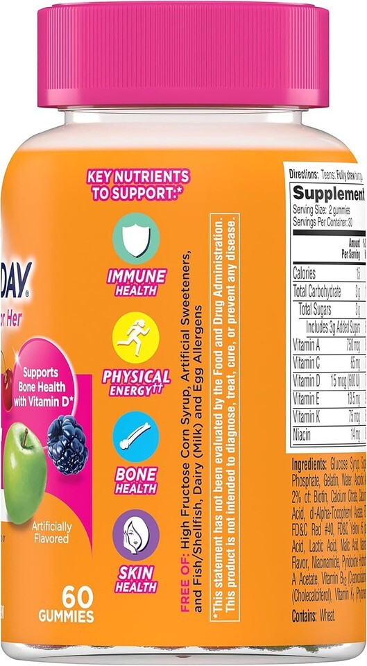 One A Day For Her VitaCraves Teen Multivitamin Gummies offer a wide variety of key vitamins and minerals. This easy to take gummy contains nutrients specially selected to support the overall health of teenage girls. This daily multivitamin contains Vitamins A, B6, B12, C, D, E, and K, Niacin, Folic Acid, Biotin, and Calcium. One A Day For Her VitaCraves Teen Multivitamin Gummies are formulated to support bone health, immune health, and physical energy by helping convert food to fuel. Teenage girls should fully chew two gummies daily. One A Day Multivitamins can provide nutritional support that you and your family may need at every life stage. This statement has not been evaluated by the Food and Drug Administration. This product is not intended to diagnose, treat, cure, or prevent any disease.Covered by the Bayer HealthCare ? Consumer Health 60-Day Satisfaction Guarantee. See below for details.