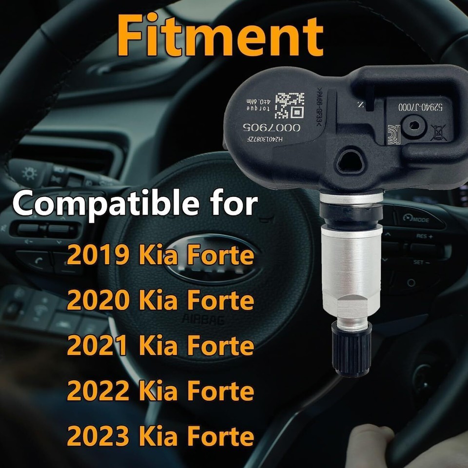 Fitment: Compatible with 2019-2023 Forte Relearn is Required: The Tire Pressure Sensor is Pre-Programmed,Not Require Programming, But You Need to Re-Learn It with The Tools, As Shown on The Details Page Quality: High level of accuracy and sensitivity, enhance safety of your vehicle Compatibility: Avoid buying the wrong product,Please use Amazon Part Finder above to verify fitment. Or Refer to the details page for specific applicable vehicles Buy with Confidence: Any Questions Please Let Us Know, We Will Give You the First Time Satisfactory Reply