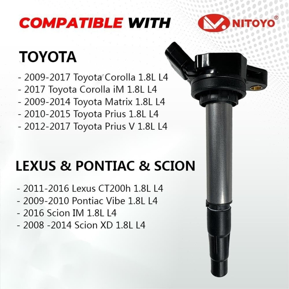 ?Fitment?Ignition coils and spark plugs Compatible with Toyota Corolla 2009-2017 1.8L, Corolla 2011-2013 2.4L, Corolla IM 2017-2018 1.8L; Compatible with Matrix Toyota 2009-2014 1.8L, Prius 2010-2015 1.8L, Prius V 2012-2017 1.8L; Compatible with Scion IM 2016 1.8L, 2008-2014 Scion XD 1.8L; Compatible with Lexus CT200H 2016 1.8L, Pontiac Vibe 2009-2010 1.8L ?Durable Material?It is made of reinforced materials to insure it lasts longer than the factory part, high temperature resistant housings and high impact resistant materials to prevent high voltage leakage and withstand extreme temperatures. ?Directly Replace?It can directly replace original OEM part and work like the original one. OE Number: UF596, UF-596, UF619, 90919-02258, 90919-02252, 90919C2005, 52-2126, IC686, C1714, E1096, GN10341, C1714-4, E1119 ?Easy Installation?Fast and easy installation with superior performance and reliability. Please make sure that each part is installed on the correct part, professional installation is highly recommended. ?Package Include?4 Set Ignition Coil Packs and Spark Plugs.Before buying, research to make sure the part fits your vehicle; enter all vehicle information (year, make, model, engine, and interior) to ensure compatibility, and check the qualifying instructions and that a professional installation is recommended