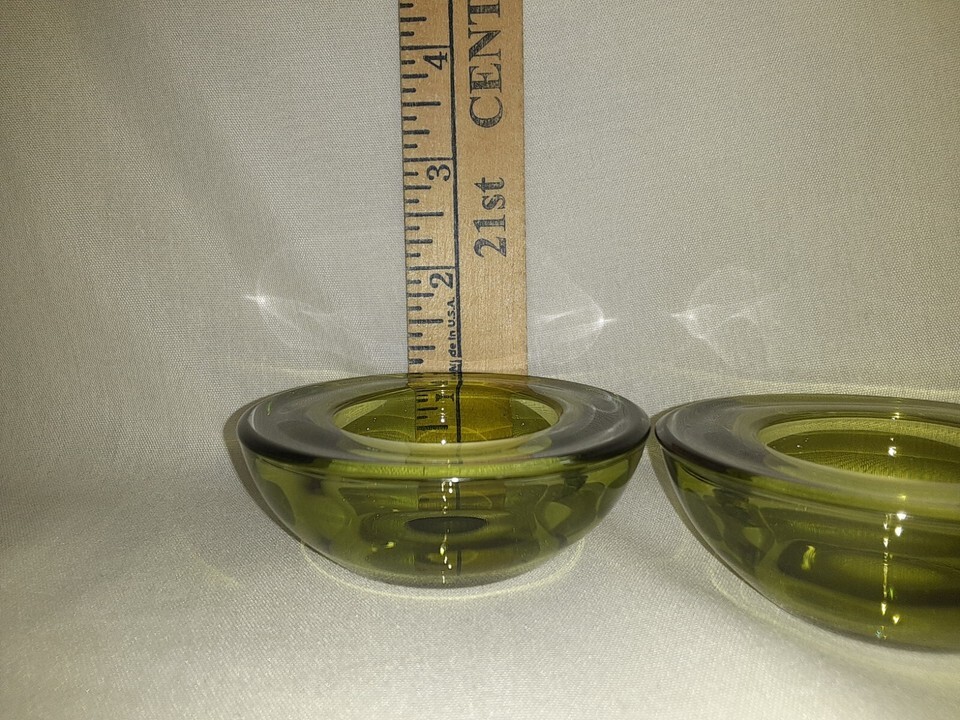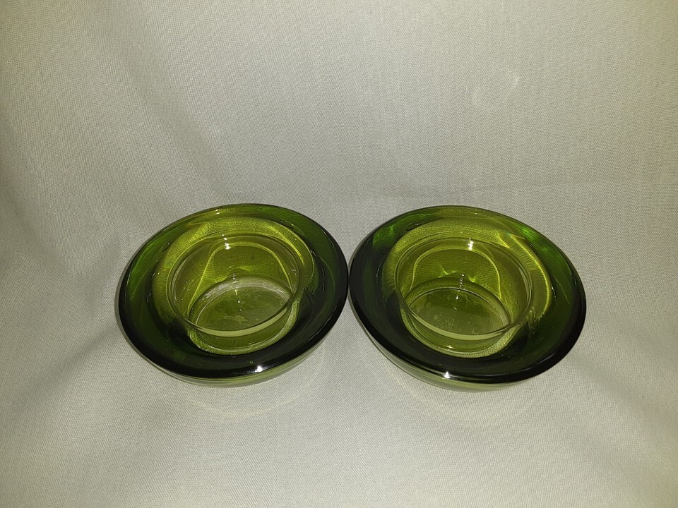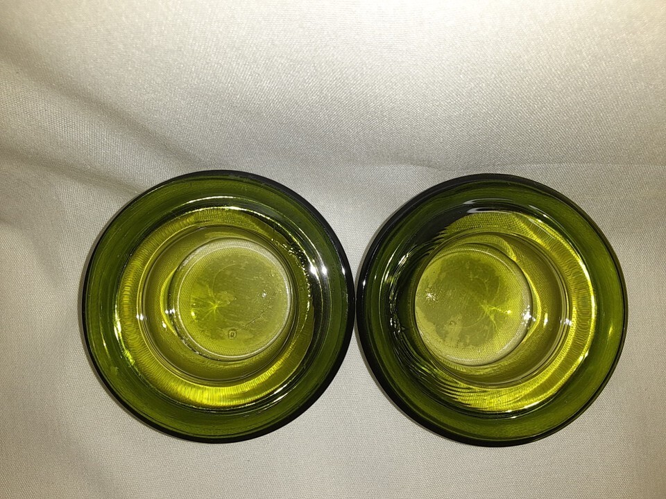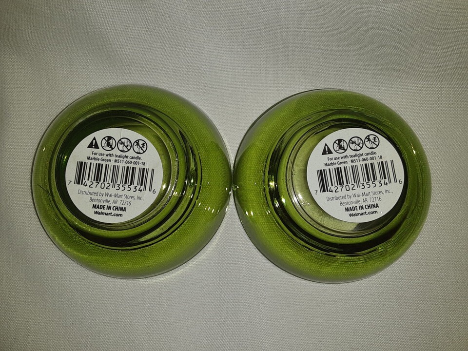 This is a set of chunky marble green glass tealight candle holders. They are in very good condition with no chips or cracks. The original sticker on the bottom of the holders states that they were distributed by Wal-Mart Stores and made in China. Candles are not included.
