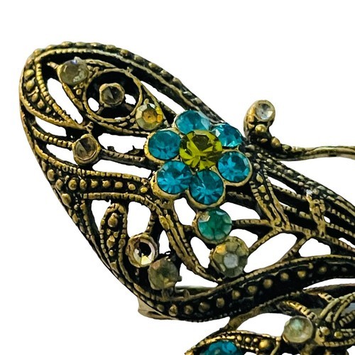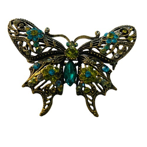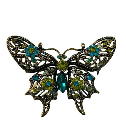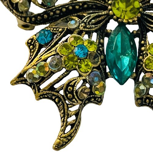 This beautiful vintage brooch pin features a stunning butterfly design that is sure to catch the eye. The piece is adorned with big teal green and white rhinestones that sparkle in the light. The intricate filigree metalwork adds a touch of elegance to the overall design.