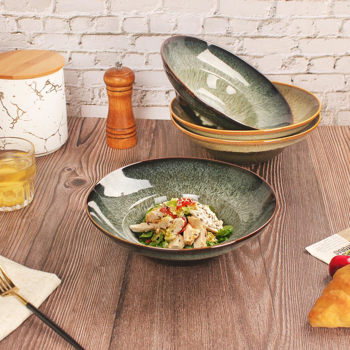 Our products are a unique glaze color, glaze color change (Chinese jun glaze ceramic) process has a thousand years of time, very beautiful, Using the production process of reactive glaze,The biggest feature of this process is the color of each product is unique and cannot becopied, Due to a certain temperature difference during firing, the same color material is used to produce ,finally maybe will have 3-4 colors which is different.,Larger size capacity: 10 oz in the recess, 35oz maximum capacity, size: 9x9x3 inch, suitable for okra soup, fruit salad, pasta, Soup, Japanese Ramen, Vietnamese Pho, Asian Noodles and Dishes, etc.,Novel design: the design follows the characteristics of the middle recess to meet the people who want to control the volume, and in the original wide part of the design into a wide bend, so that the bowl/plates set can hold more than the recess capacity of salad or soup and keep the dishes from spilling out. let this plate and bowl sets decorate your dining table and kitchen. (Larger capacity than other plates with a lip edge;Easy to hold),Material: Serving dishes made of high-temperature fired food-grade ceramic material are smooth and easy to cleanand and stacking, refrigerator, oven, microwave, and dishwasher safe.,Creative gift: Elegant ceramic deep plates will delight your family and guests at dinner parties, a choice for hospitality bowls and housewarming gifts, tested packaging, will be more securely delivered to your friends and family.