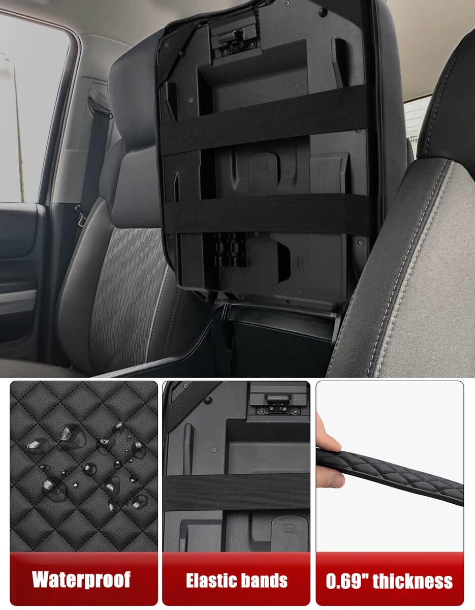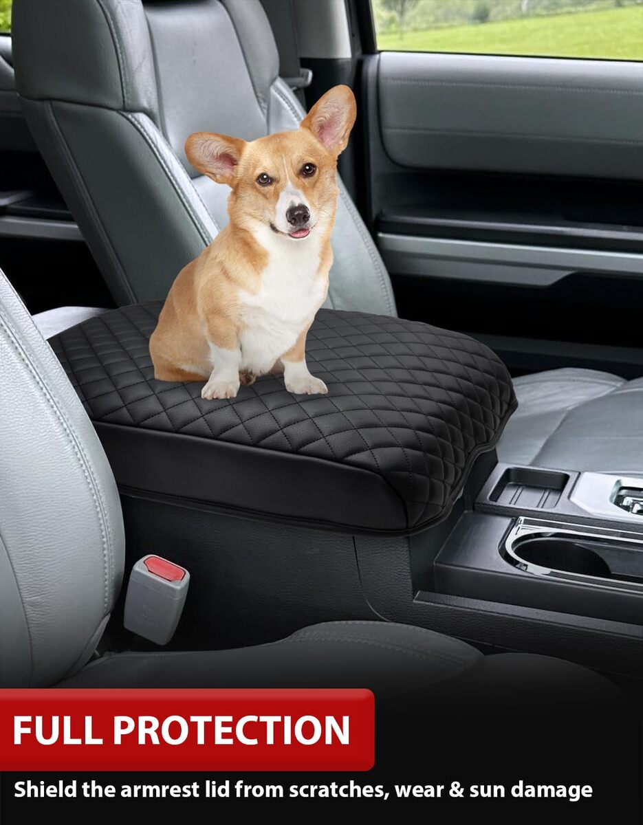 CUSTOMIZED TRIM - This center console cover meets OEM standard which is exquisitely crafed, well compatible with Toyota Tundra 2014 2015 2016 2017 2018 2019 2020 2021,IMPROVE DRIVING EXPERIENCE - Top vinyl leather high density sponge made protector, soft to touch and provide good support to elbows, you won't feel arms tired during long driving,SCRATCH RESISTANT - Great protection for the middle console lid, wrapping the entire compartment to keep clean and avoid scratches from pet claws, keys etc,EASY INSTALLATION - You can easily slide the arm rest covering onto console without using any tool. There are 4 elastic bands at the back which help to keep itself in place, no sliding back and forth,PACKAGE CONTENT - 1 x armrest cover. The pictured console and lid are not included