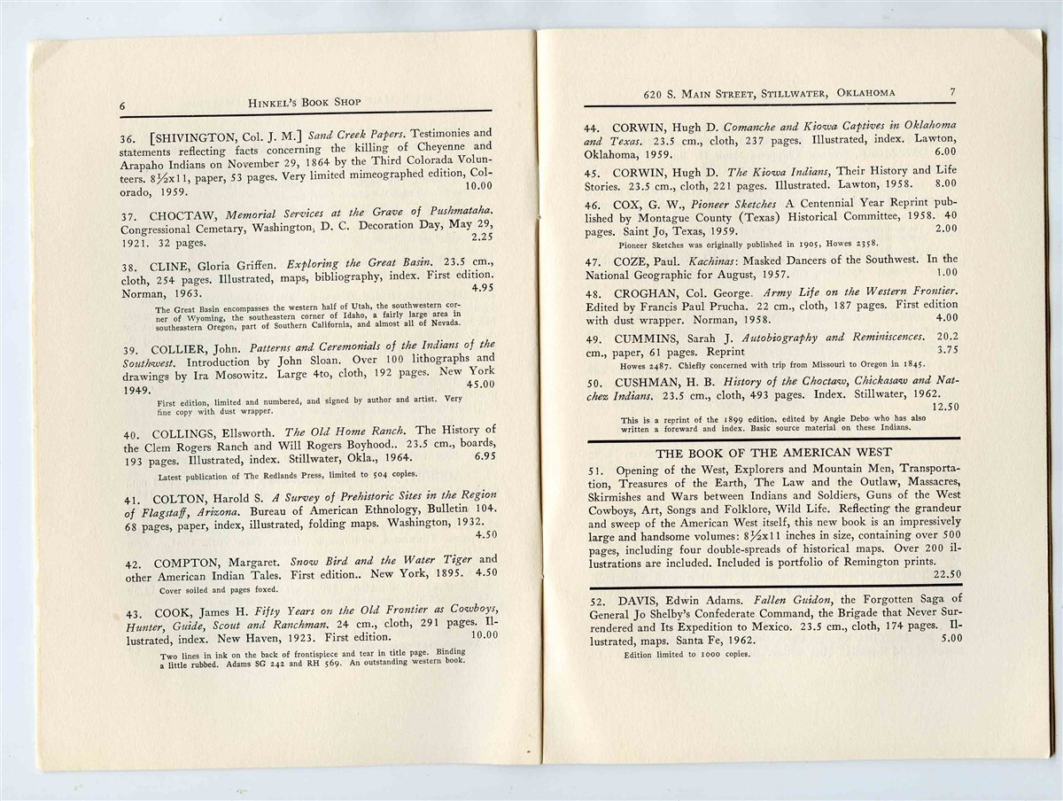 A 24 page soft cover book with detailed listings of books for sale. Hinkel's Book Shop . From 11-64 , The Boomer Number 49 Catalog. From this well known book store in Stillwater Oklahoma. Measures about 5"x 7 1/2"when closed. Has some markings in the book.