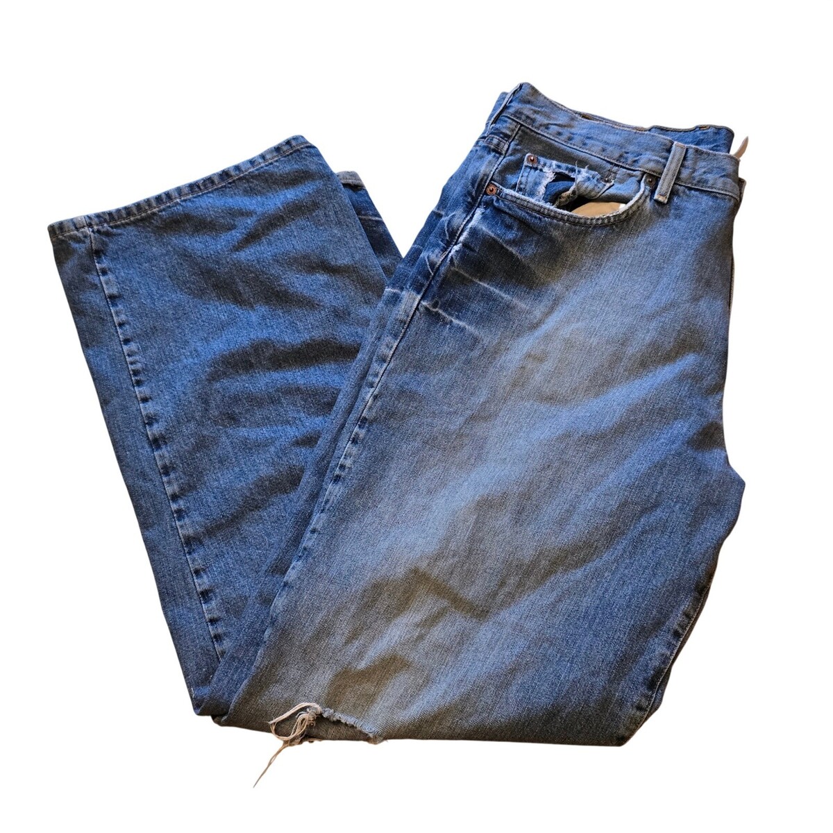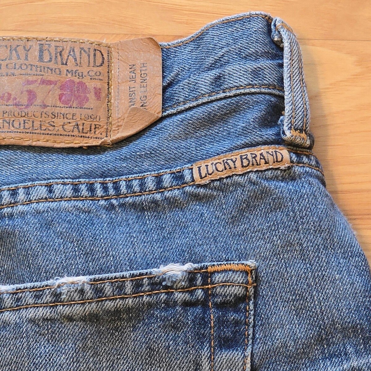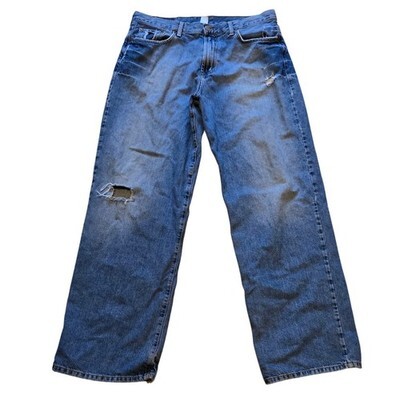 Keywords: Grunge, Indie, Y2K, Skater, Workwear, Distressed Denim, Frayed Hem, Relaxed Fit, Streetwear, Rugged Style, Classic Blue Jeans, 90s Aesthetic, Sustainable Fashion, Thrifted Look, Lucky Brand Denim