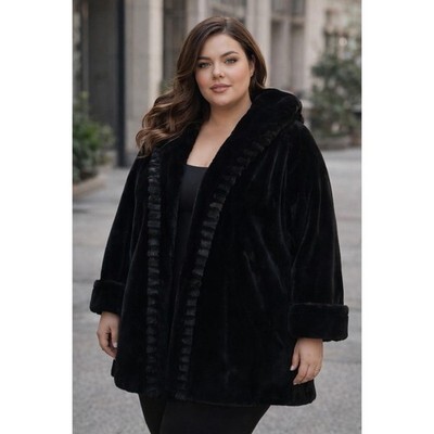 Gallery New York Black Faux Fur Hooded Coat Womens Plus Size 2X Mid Length Glam