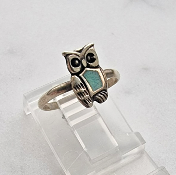 VINTAGE small 925 STERLING SILVER TURQUOISE OWL RING SIZE 3