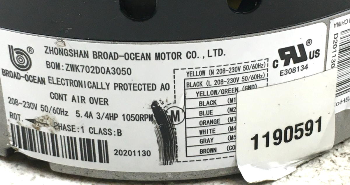 BROAD-OCEAN ZWK702D0A3050 Blower Motor 1190591 K00210052 230V 3/4HP used #ME385