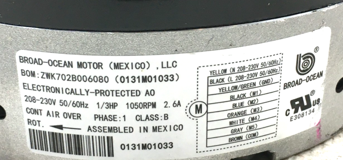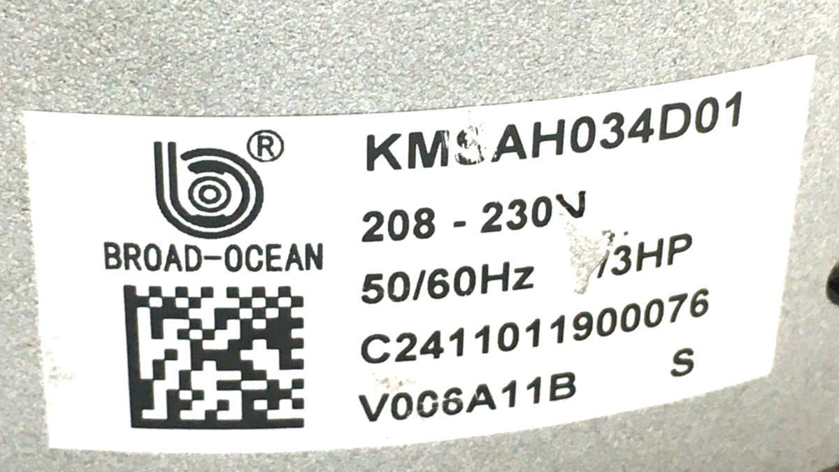 This is BROAD-OCEAN ZWK702B0060880 ECM Blower Motor KMSAH034D01 208/230V 1/3HP Goodman p/n 0131M01033 1050 RPM 50/60 Hz used part.