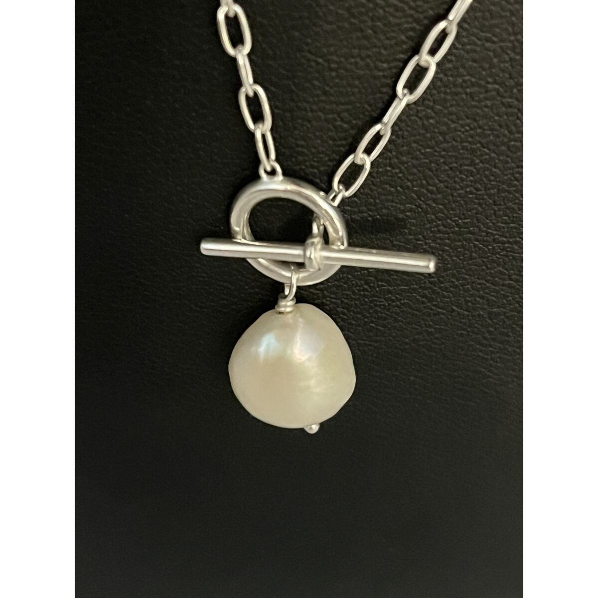 This 18" necklace features a toggle clasp that doubles as decoration with a shiny pearl drop. No need to layer up other chains and chokers. Its silver chain means it matches everything, so pair it with anything in your wardrobe. The piece comes with a ''.925'' sterling silver quality stamp as a symbol of guaranteed product quality.