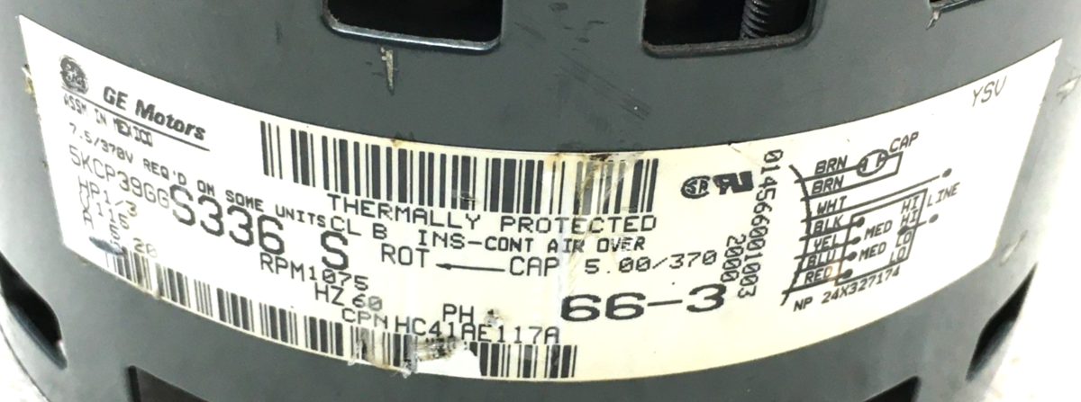 This is GE 5KCP39GGS336S Blower Motor 1/3HP 1075RPM 1PH 115V HC41AE117A used part.