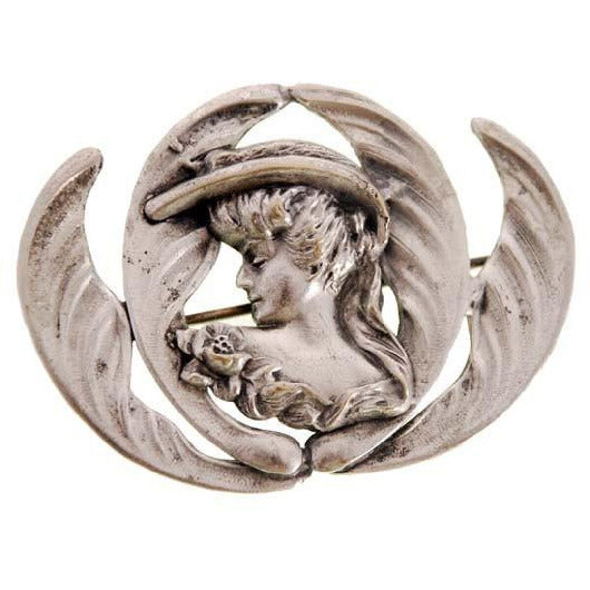Repousse (repousse) is a centuries-old metalworking technique used extensively during the Art Nouveau period (1890?1915) to create sculptural relief imagery inspired by nature and feminine beauty. This brooch reflects the enduring influence of that era, likely produced during the mid-20th-century Art Nouveau revival when classical female profiles and organic motifs became highly desirable in collectible costume jewelry.