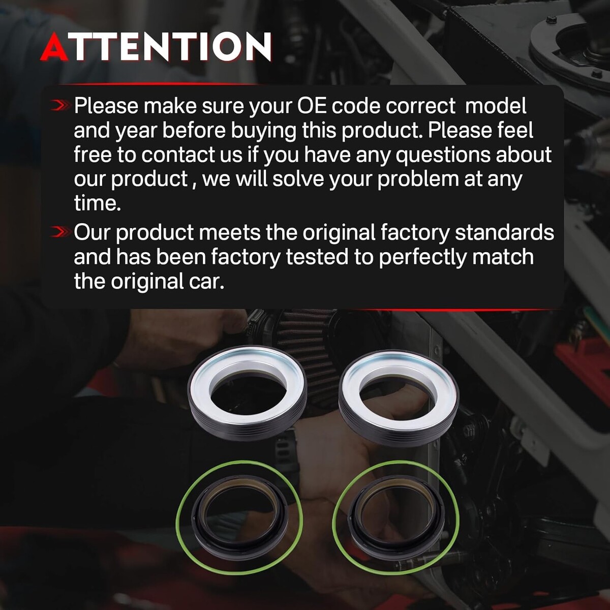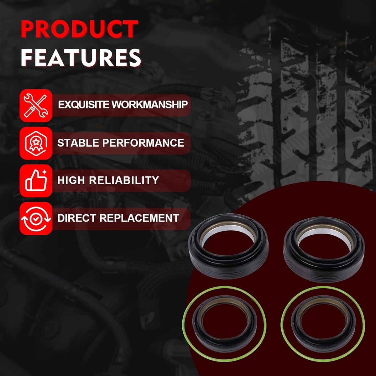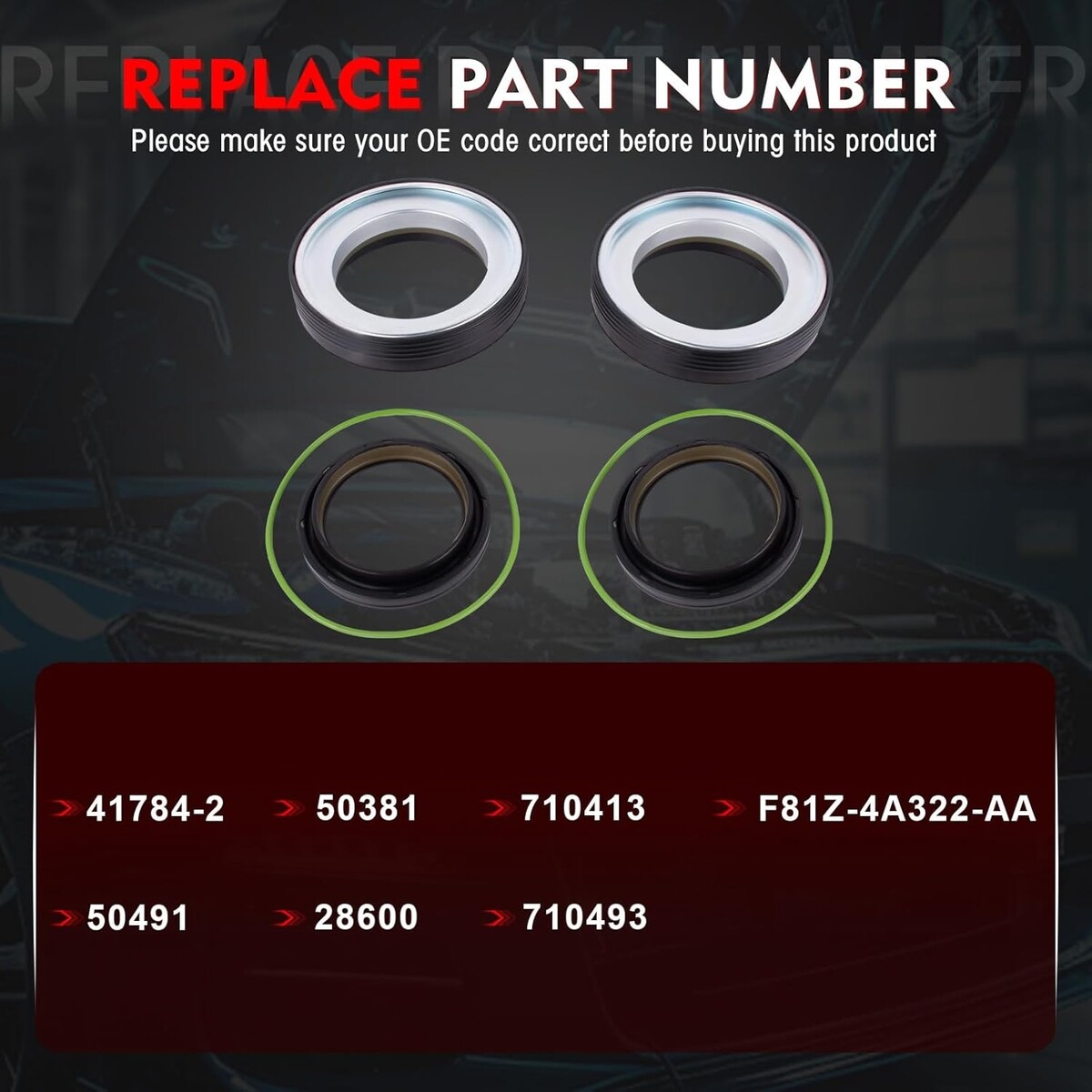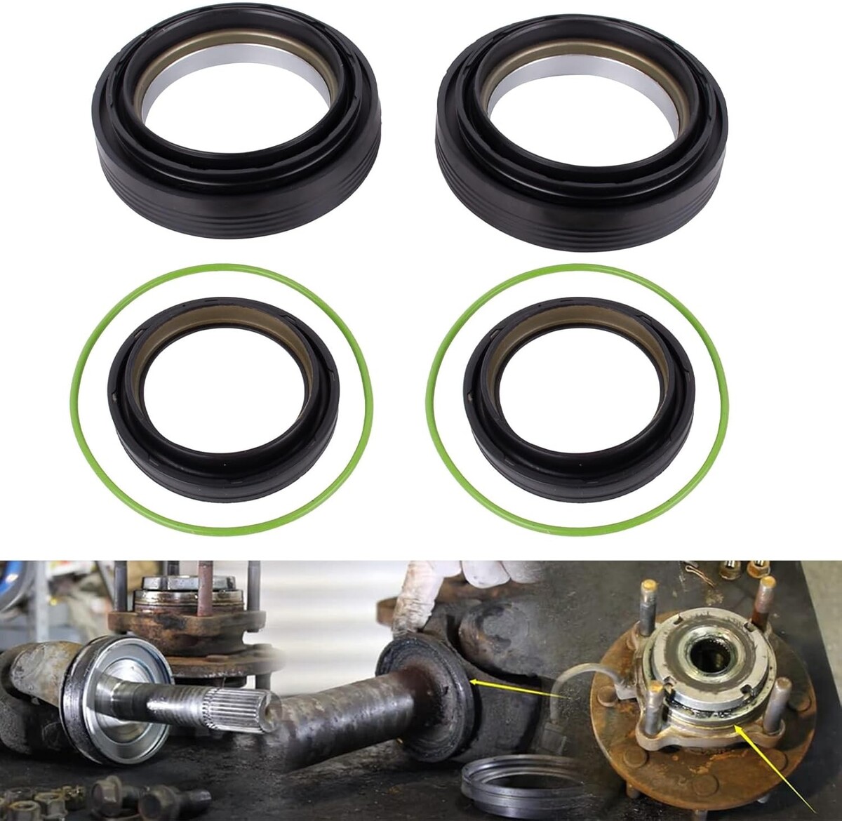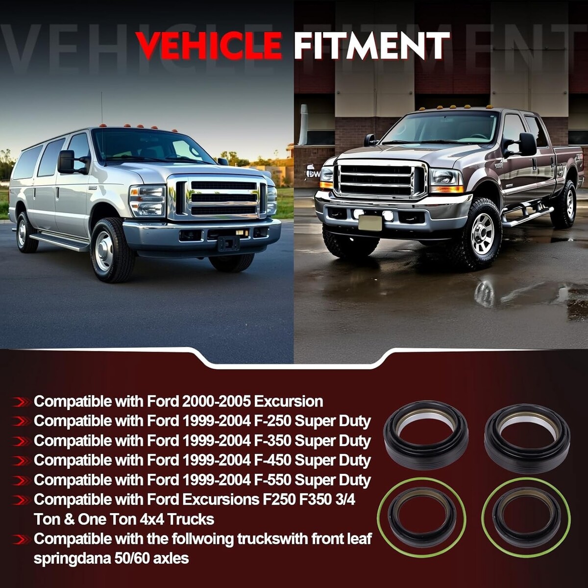 Compatible Models: This front axle knuckle tube seal kit compatible with 1998 1999 2000 2001 2002 2003 2004 2005 Ford Super Duty F-250 F-350 F-450 F-550 Excursion 4X4 trucks with front leaf spring Dana 50 / 60 axles. Also fits Ford Excursions F250 And F350 3/4 Ton And One Ton 4x4 Trucks Package Include: The front axle seal kit includes: 2 x Inner Knuckle Oil Seals(50491, 28600, 710493), 2 x Outer Tube Oil Seals(50381, 710413), 2 x Vacuum Seal O-Rings(41784-2, F81Z-4A322-AA), total 6 pieces Premium Material: This 50491 front axle knuckle tube seal kit is made of premium steel and rubber, high temperature resistant and corrosion resistant. It is thoroughly tested to ensure performance and lasting quality High Performance: The front oil seal kit adopts a precision sealing design to prevent lubricant leakage and block harmful contaminants from entering. Premium materials and reinforced housing help prevent installation damage and improve efficiency and ensure long-term use Warm Tips: Please check your OE number and car model before purchase the front axle knuckle tube seal kit. If you receive products with any quality problems can be returned or exchanged within one year. We will provide you with timely service and support
