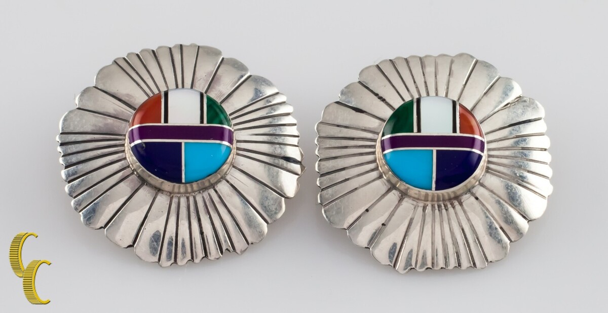 Sterling Silver Lapidary Inlay Sunburst Clip-On Earrings Gorgeous!