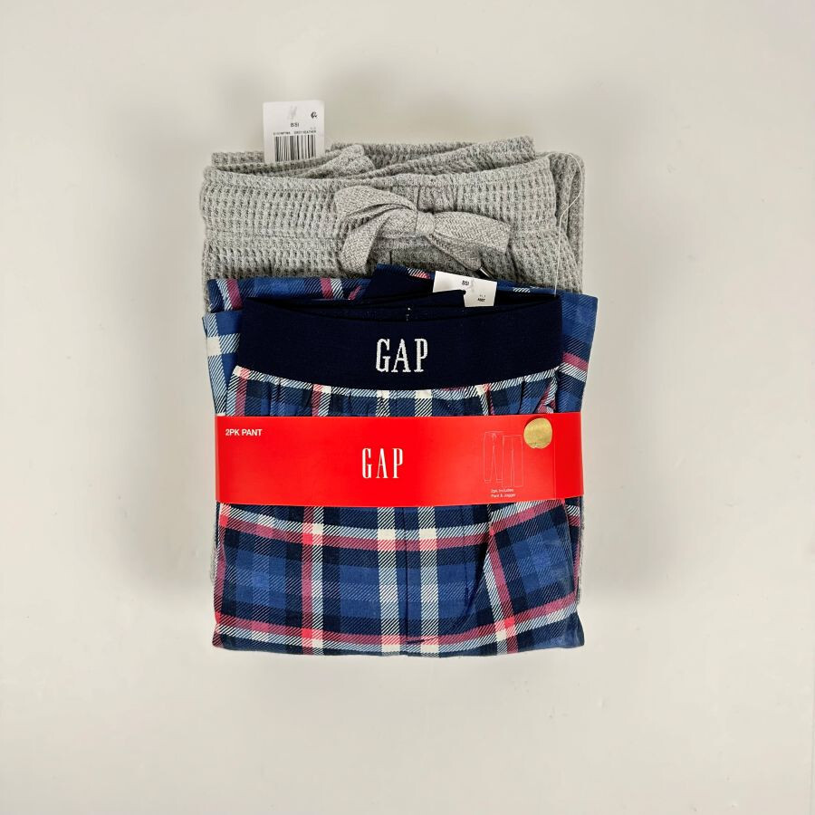 Gap gets comfy with a two-pack of pajama pants. Each pair features a waffle-knit fabric and a jogger-leg silhouette.Pack of two pajama pantsSits low on waistTapered fitElastic waistband with drawstringSide pockets; single patch pocket at backBanded cuffsPant 56%Cotton, 40% Modal/ 4% spandex Jogger 58% cotton/ 42% PolyesterMachine washImported