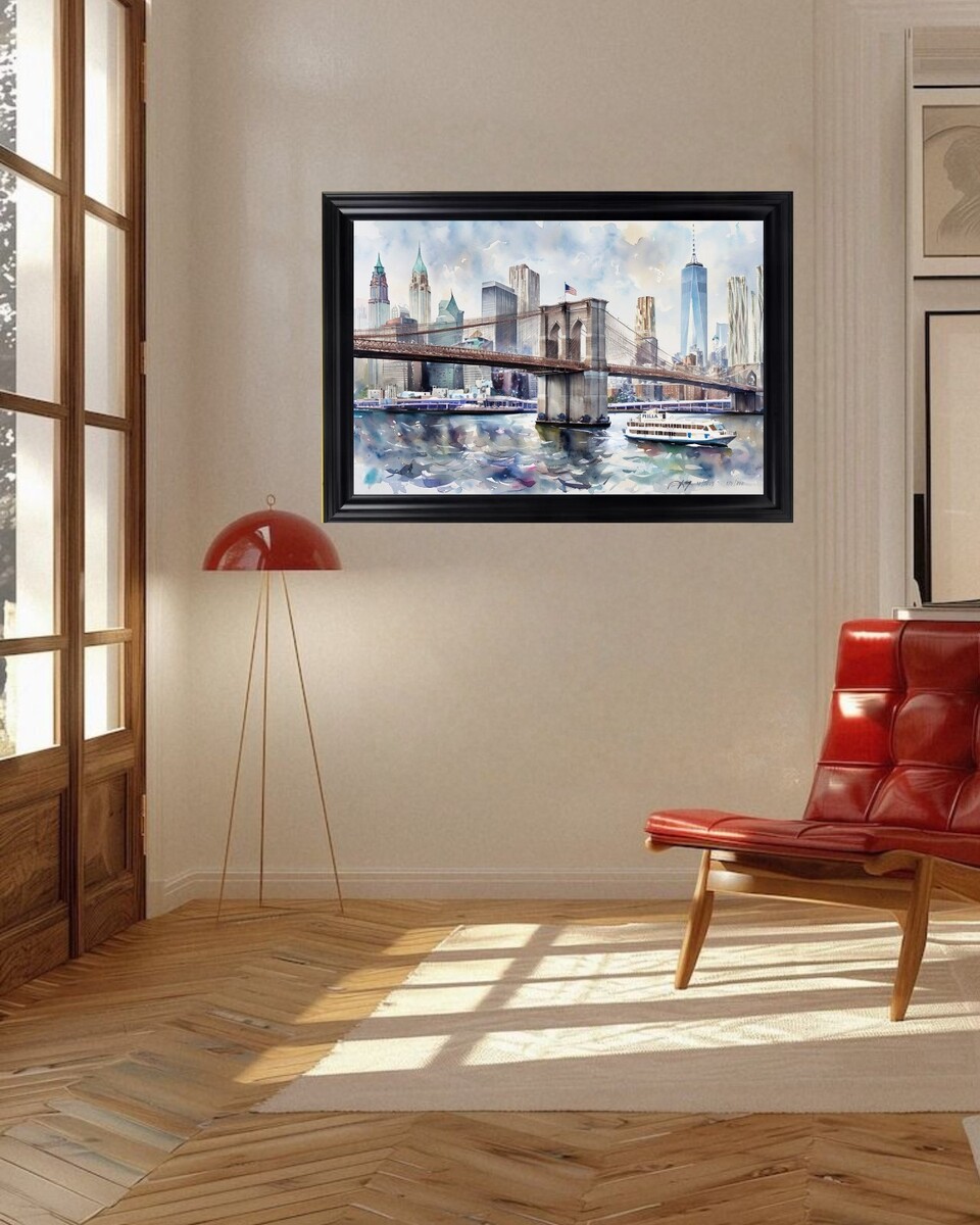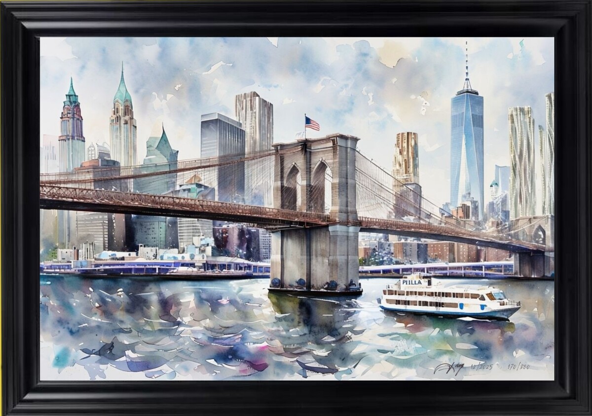 The product is a 24x36 hand-signed watercolor giclee art print by artist Devon Rodriguez, featuring a portrait of New York City. This limited-edition print, produced in 2025, showcases a unique blend of 3D, Art Deco, and Abstract styles, reflecting the vibrant and dynamic energy of the city. Made on glossy paper with a giclee print technique, this artwork from Rodriguez is a beautiful and collectible piece that captures the essence of New York in a dynamic and artistic way.