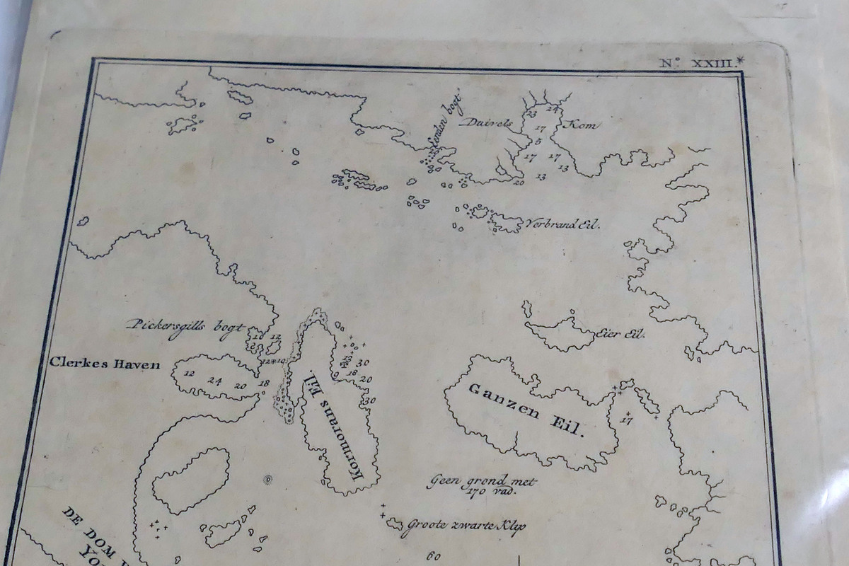 Original late?1700s Dutch nautical map from the Dutch edition of Captain Cook’s Second Voyage. Titled “Kersmis Kanaal, aan de Z.W. Kust van het Vuurland” (Christmas Channel, Southwest Coast of Tierra del Fuego), Plate XXIII.
