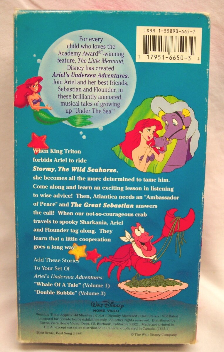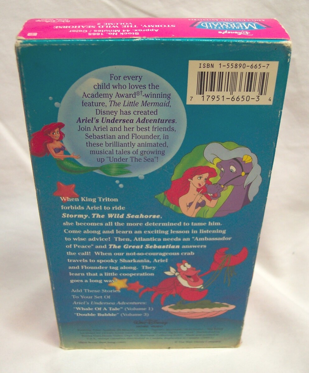 This is a Vintage Walt Disneys the Little Mermaid - ARIEL'S UNDERSEA ADVENTURES- Stormy, The Wild Seahorse VHS VIDEO. It has a run time of 44 minutes. It is in great condition. The case has minor wear from use. Combine auctions to save on shipping. EAG