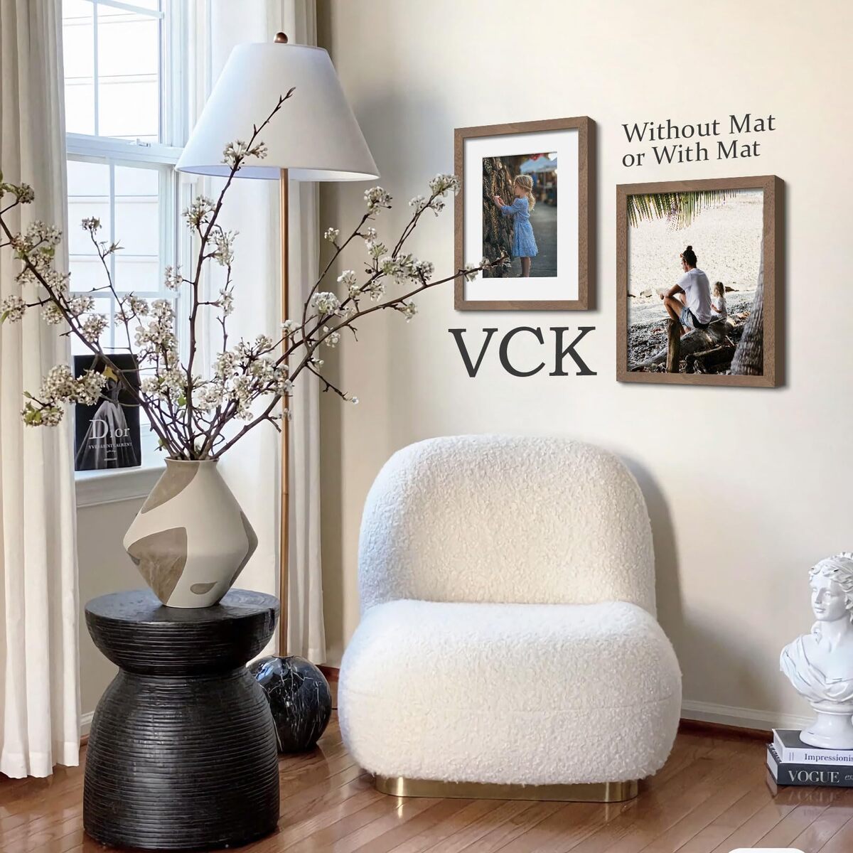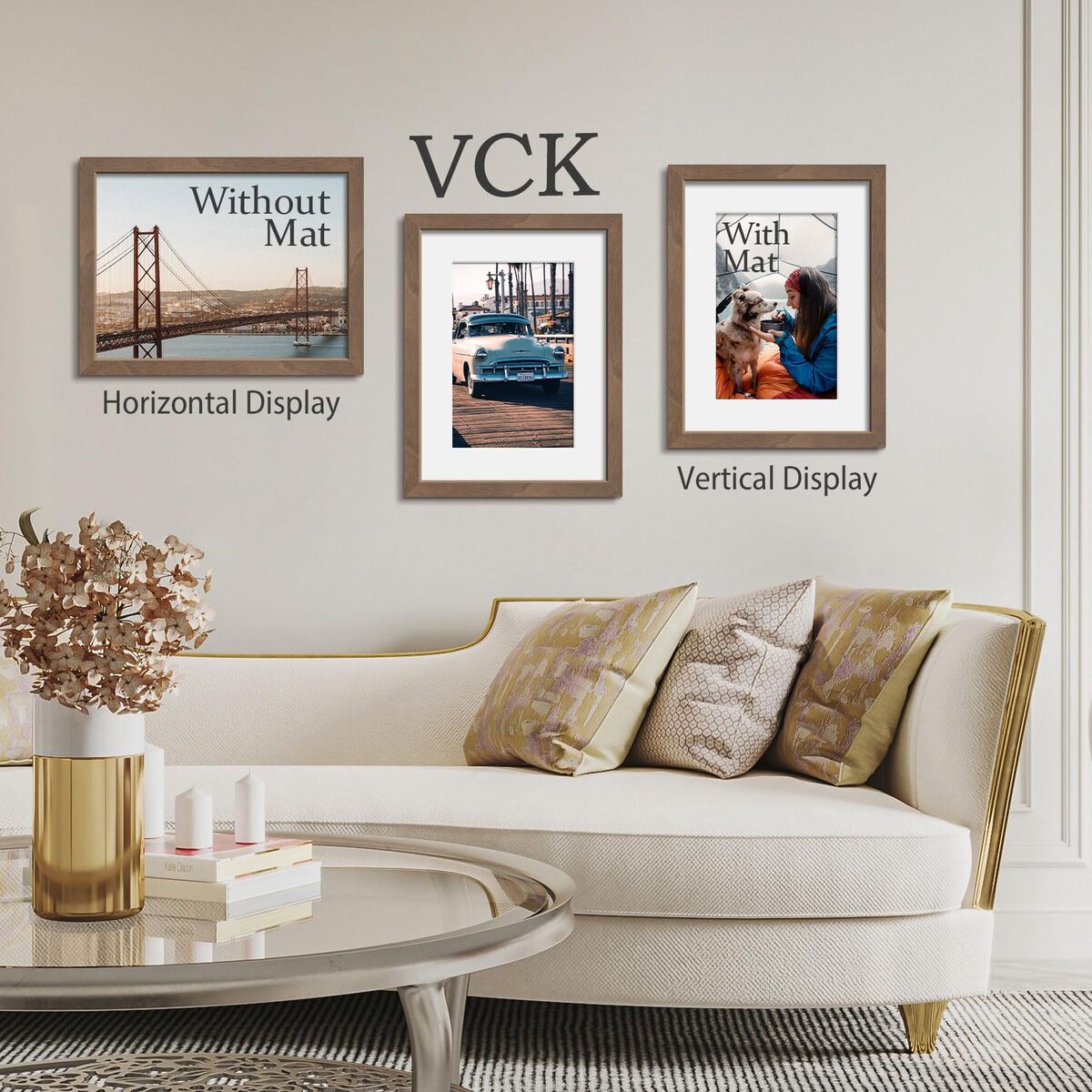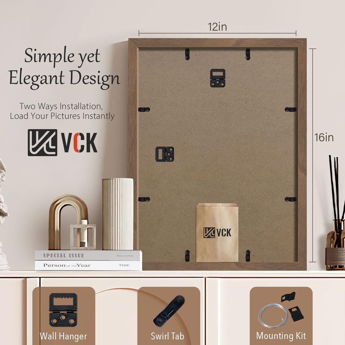 Masterpiece Redefined: Unveiled by VCK's independent design team, inspired by the Appalachian Mountains' natural charm, our brown walnut wood poster frame blends minimalism and organic aesthetics. Expertly crafted, it seamlessly complements any decor, exuding an aura of natural luxury.,Sustainable Quality: With a belief in nature's enduring beauty,VCK pairs sustainability with exceptional quality. Our durable frames, fortified corners, and back panel are designed to safeguard your treasured memories.,User-Friendly Design: This flexible frame can be easily hung on the wall, designed to display 12x16 without mat or 8x12 with mat photos with ease. Innovative design allows effortless photo insertion and switching between horizontally and vertically orientations.,Exceptional Clarity: Experience crystal-clear,ultra-HD sights with VCK's exclusive shatterproof tempered glass .Offering top-notch UV and glare protection, it's the perfect choice for families with kids?blending safety and clarity seamlessly.,"Satisfaction or Refund: At VCK, your satisfaction is paramount. We strive for excellence in our product experiences and carefully package our frames to arrive in pristine, perfect condition.